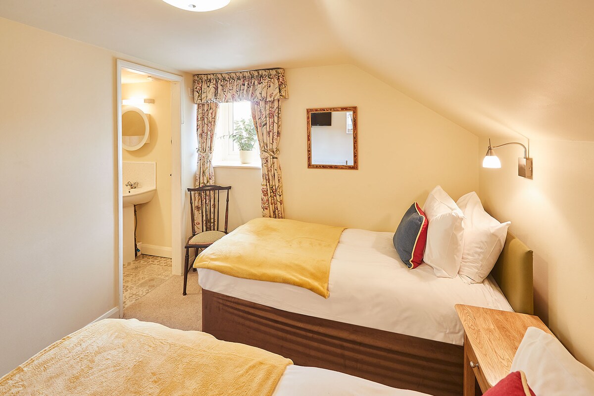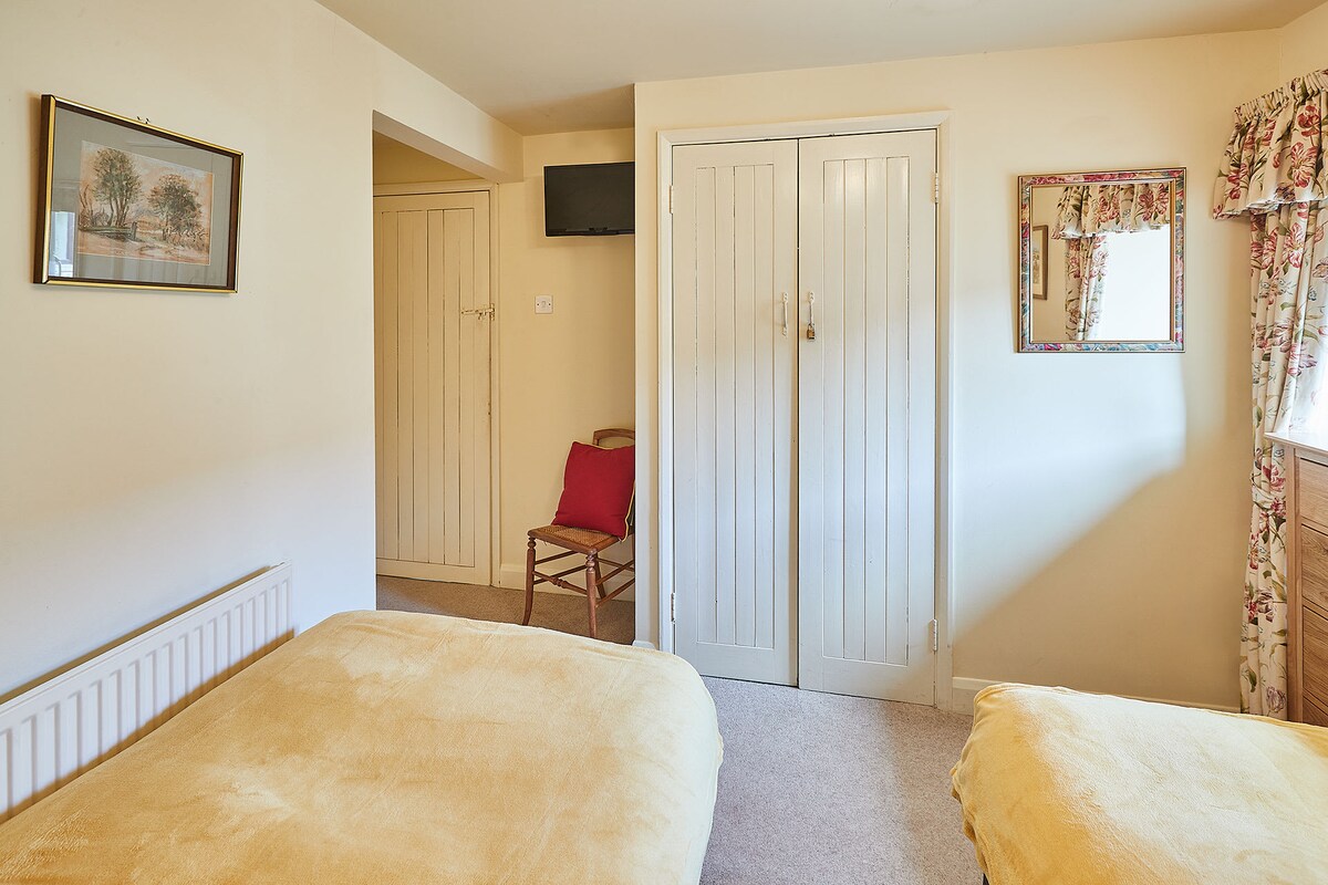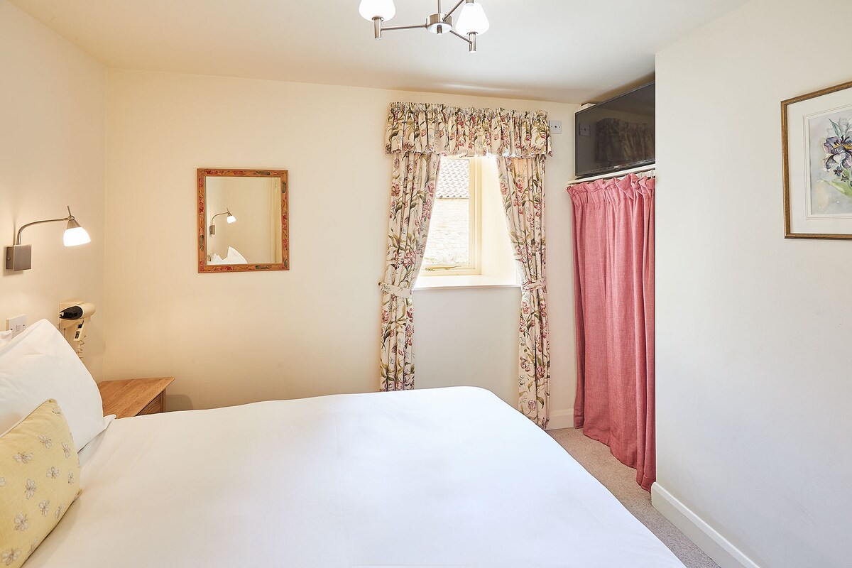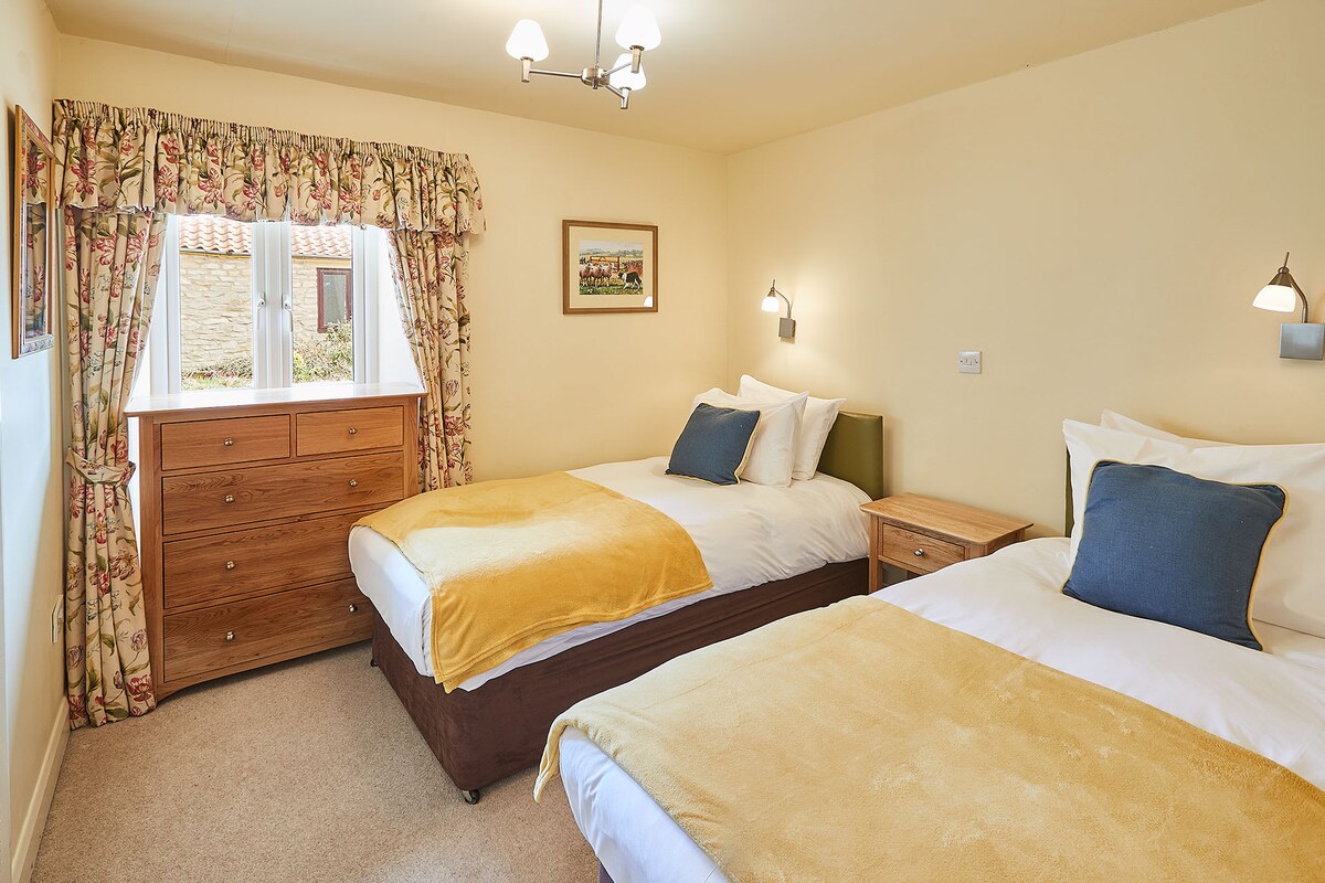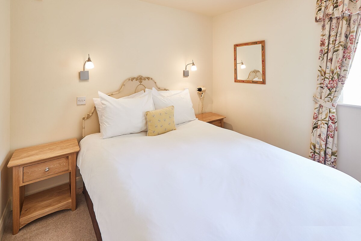 Holt Cottage has a spacious open-plan living, kitchen and dining area. Featuring a neutral colour scheme and large windows, there is a tranquil and welcoming feel. The living area includes a sofa, two armchairs and a TV so it’s the perfect place to unwind during your stay. For autumn and winter, the cottage is cosy as it is heated by a Biomass boiler.Split-level in design, the kitchen and dining area can be found up a few stairs. Fully equipped, the kitchen boasts a dishwasher, washing machine, oven, hob, kettle, microwave, toaster and refrigerator so you’ll have everything you could need for a self-catering break. Ideal for family meals, the dining area has a large wooden dining table and matching padded chairs.