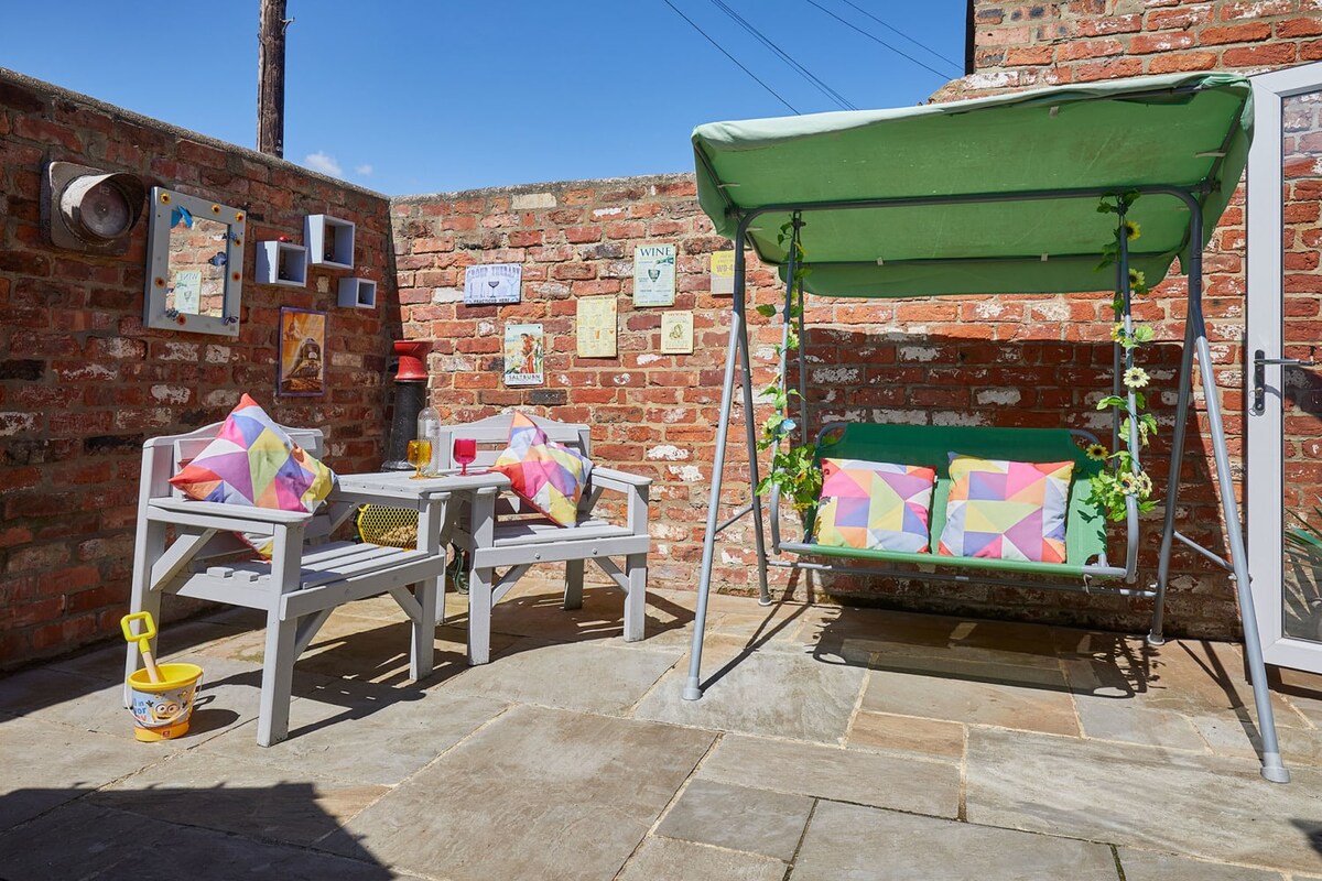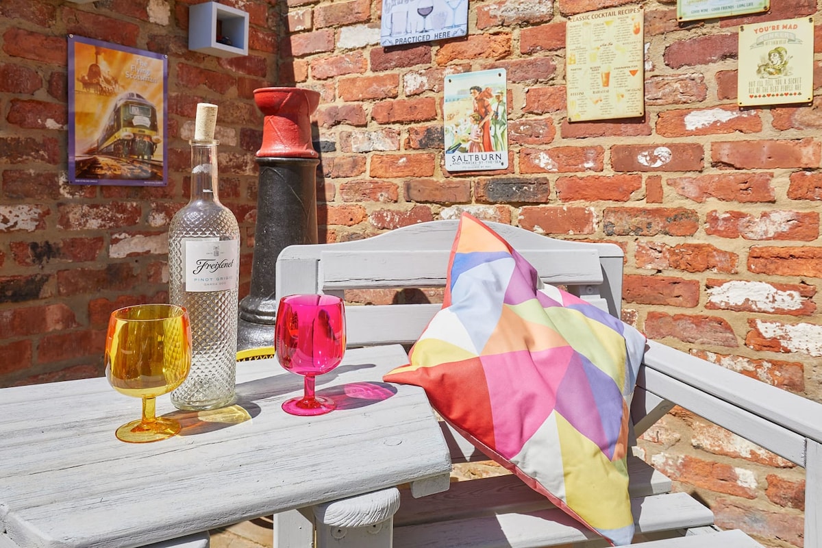 The fully enclosed back yard is a great spot to relax and soak up the sun in the warmer months. It has outdoor seating and is a great place to chill with a glass of fizz.