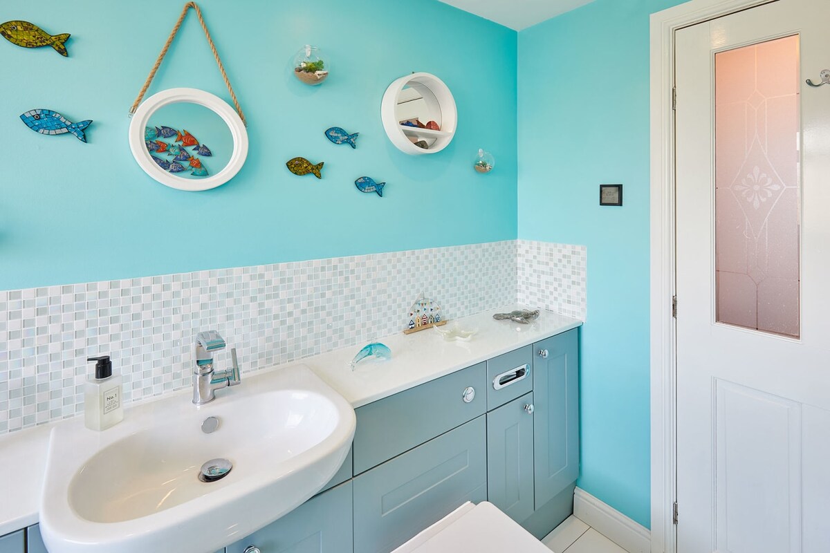 The family bathroom is a delightful space with a coastal theme. It is fitted with a bathtub, a wash basin, and a WC.