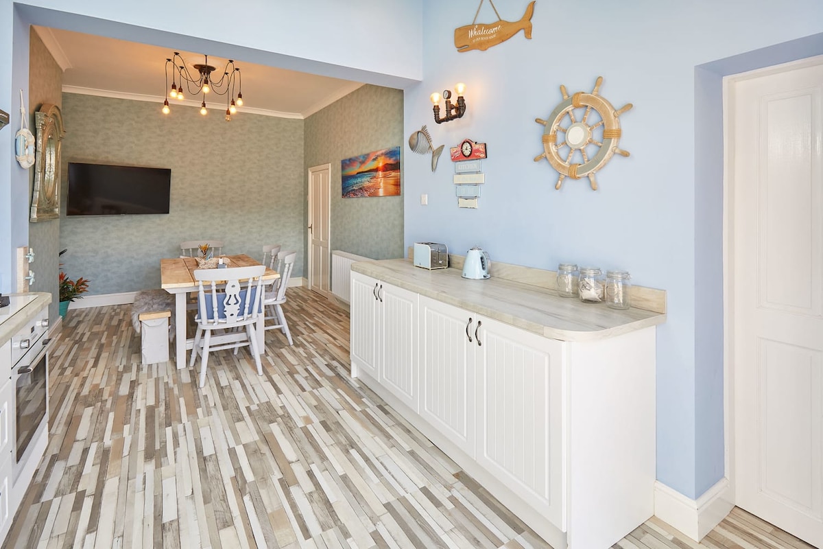 The living room at The Beach House is bright and spacious. The space boasts a sofa, two armchairs and a large coffee table. The room also has a corner dedicated to a flat-screen TV, so you can enjoy and keep up with your favourite shows whilst away on the North Yorkshire coast.The open-plan kitchen and dining area is an airy space where light can flood in through the skylight windows. The kitchen is well-equipped for self-catering getaways, whilst a dining area has ample space for all guests to comfortably enjoy a meal.