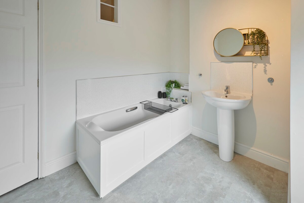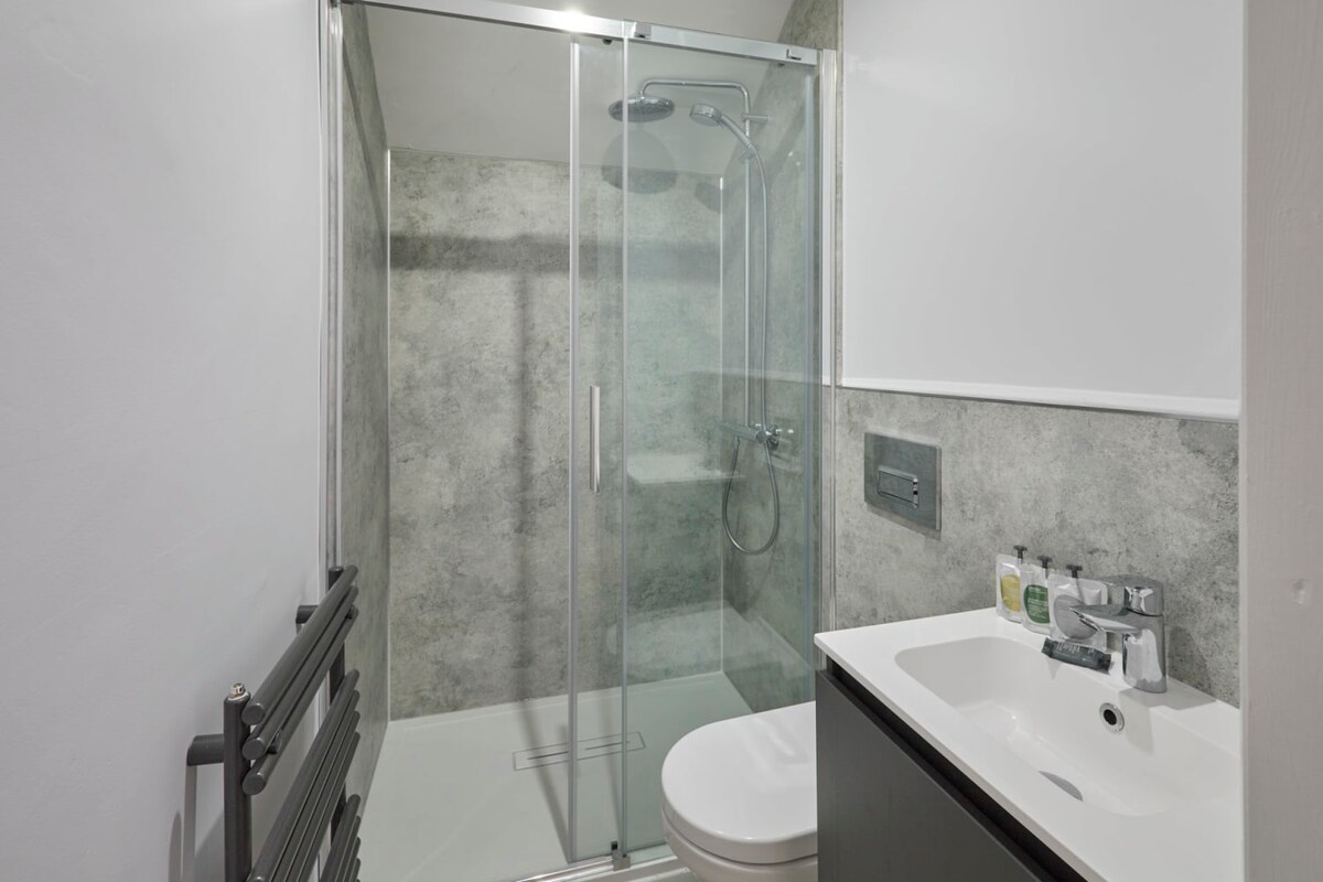 Modern in style, the second floor bathroom includes a walk-in shower, WC and basin.