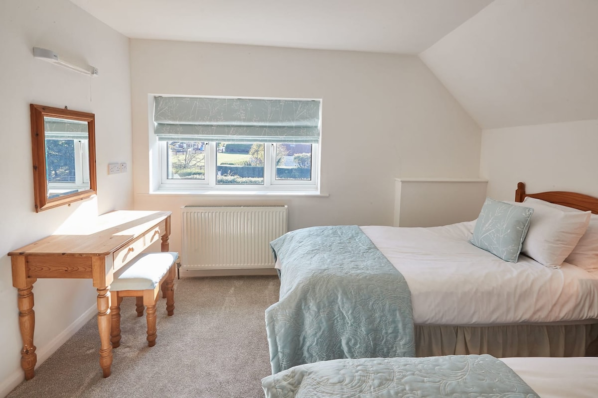 A cosy space with white walls and a sloped ceiling, the quaint room features two single beds which are complimented perfectly with light blue cushions and bed throws. It is complete with a shared wooden bedside table, a spacious wardrobe, a dressing table and a mirror. Pull down the blue roller blind and settle down for a relaxing night’s sleep.