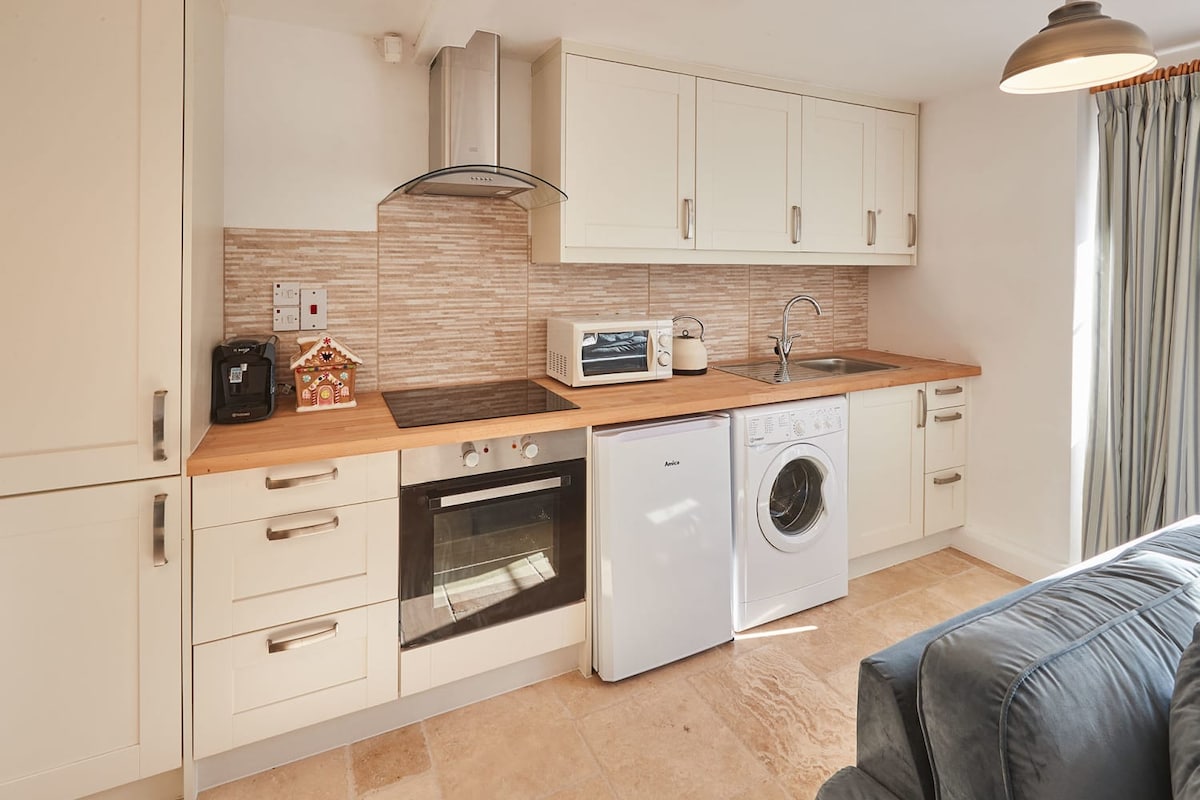 The kitchen features white cabinets and light wood worktops. You’ll have everything you need for your stay as the kitchen is equipped with an oven, fridge freezer, toaster, kettle and a microwave. The dining area includes a bistro style table and two matching chairs.