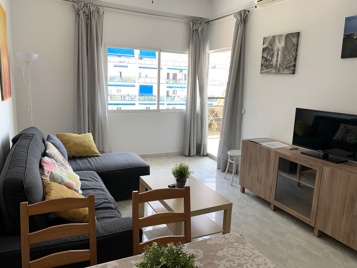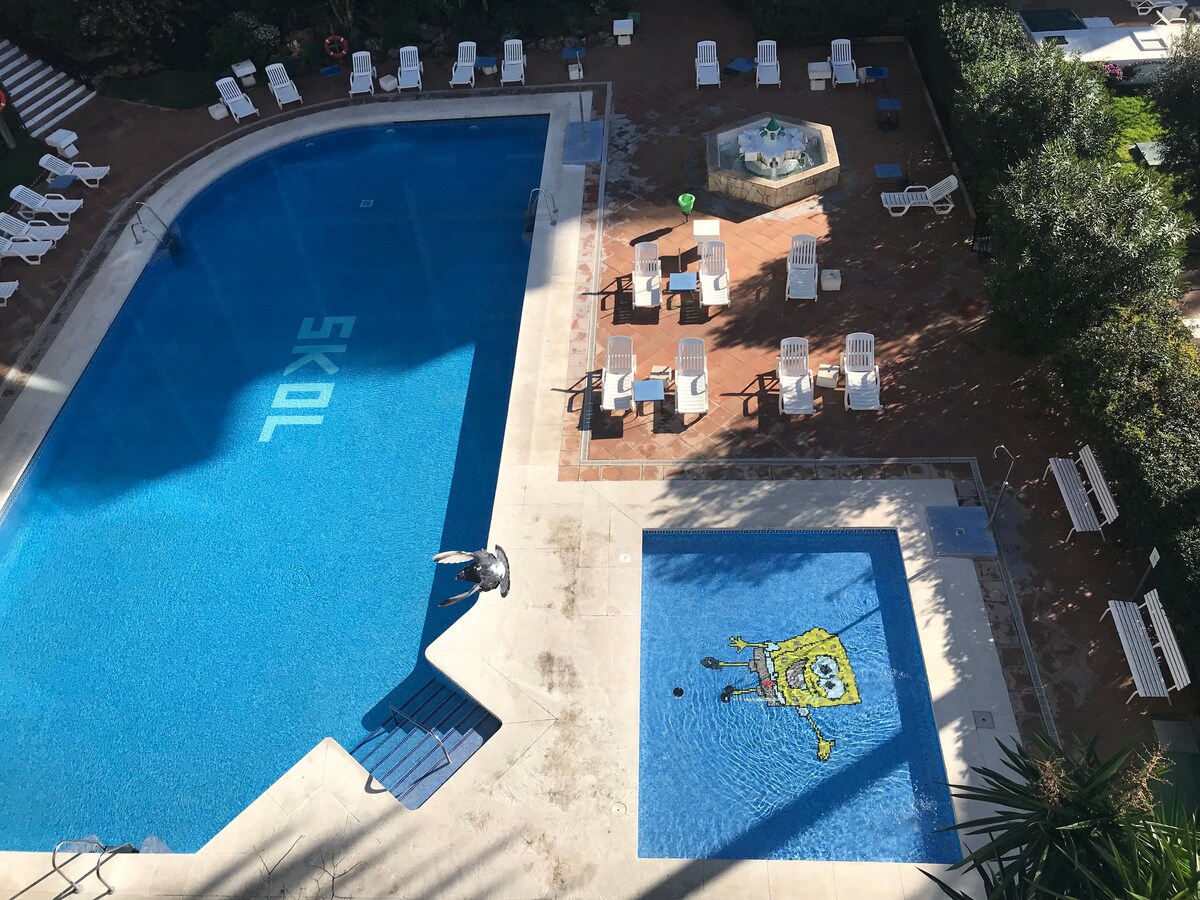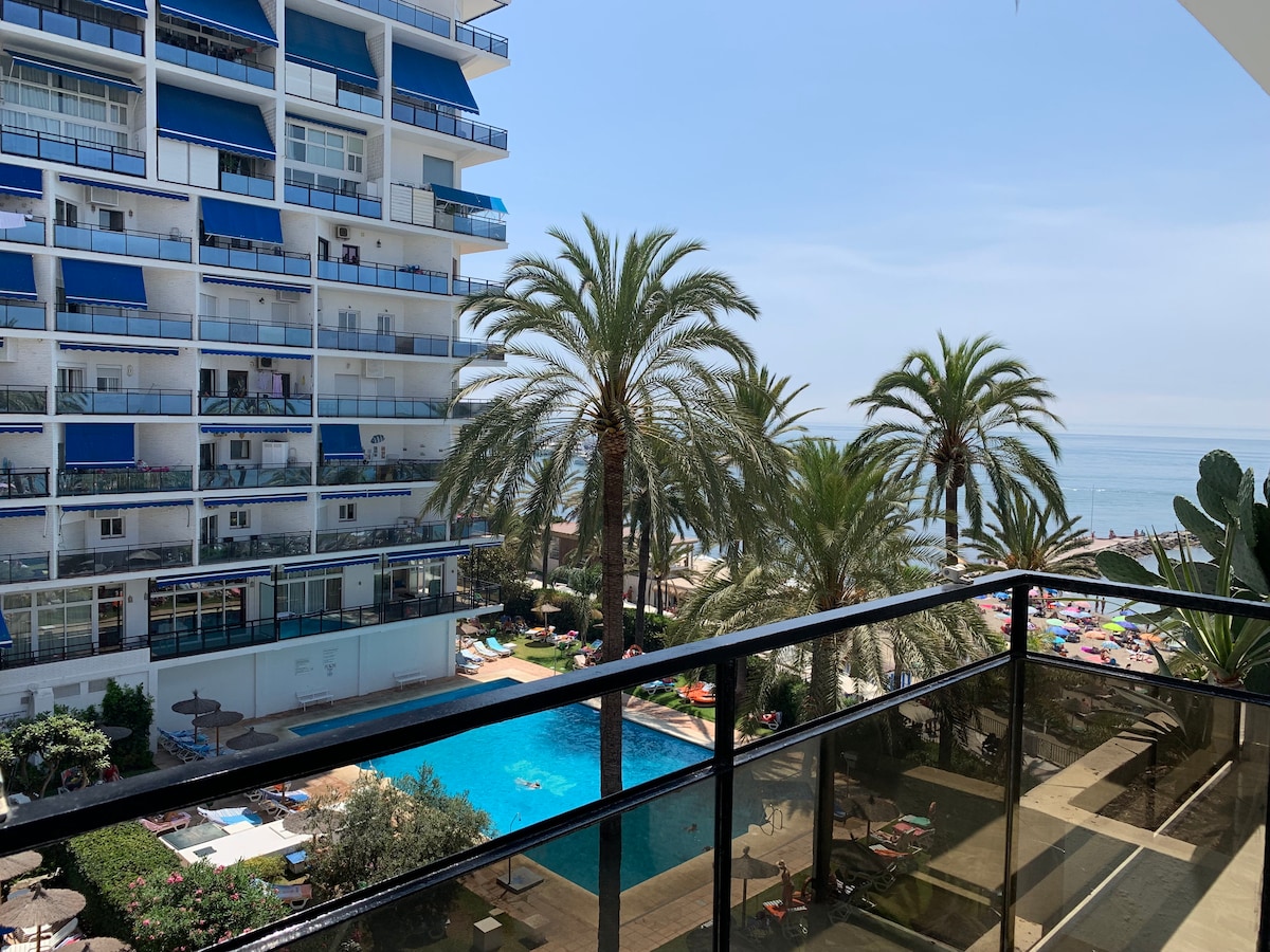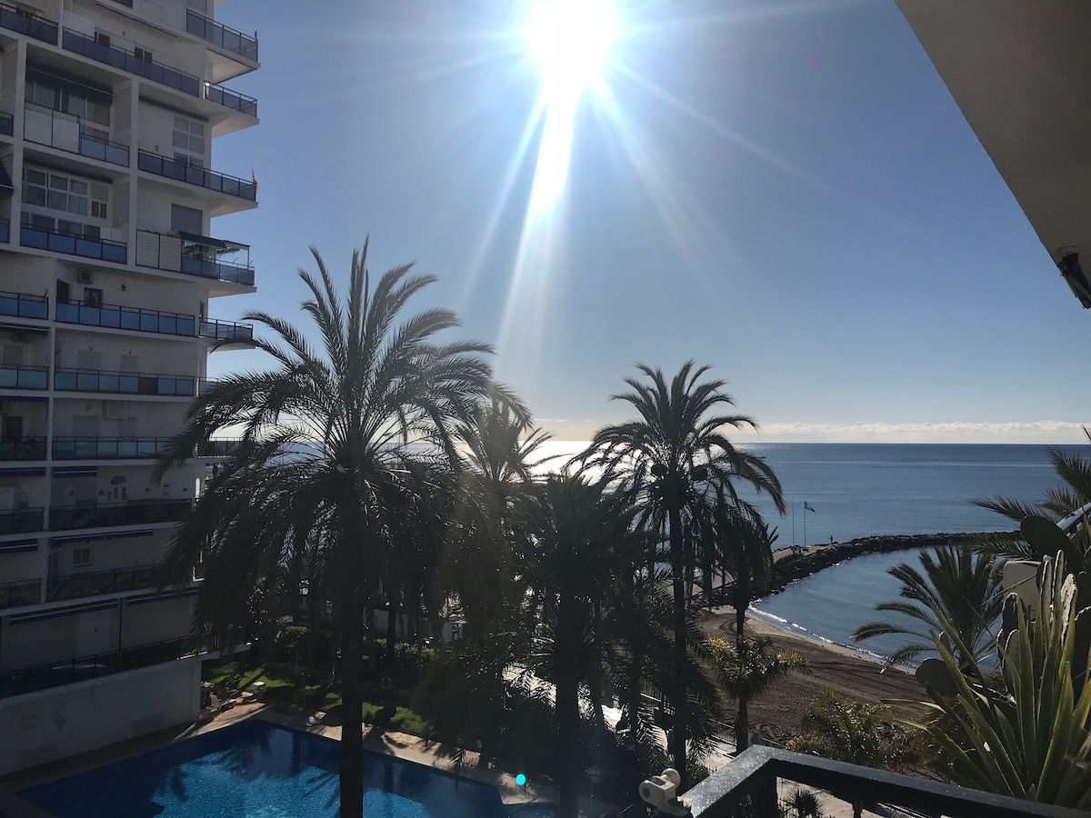 Skol Apartments Marbella - recently refurbished 1 bedroom apartment with 2 single beds and sofa bed in lounge, open plan kitchen, 4th floor, East facing with morning sun, terrace with views to the beach, pool and mature tropical garden. Fully fitted and equipped, the ideal spot for your holidays!Skol Apartments Marbella are self catering apartments set beachfront on central Marbella boardwalk with all services and amenities nearby. We offer a wide range of studios, 1-2-3 bedrooms apartments. They're all fully furnished with equipped kitchen as well as air con, heating, wifi, balcony with sea views, welcome pack and 24/7 reception and attention.