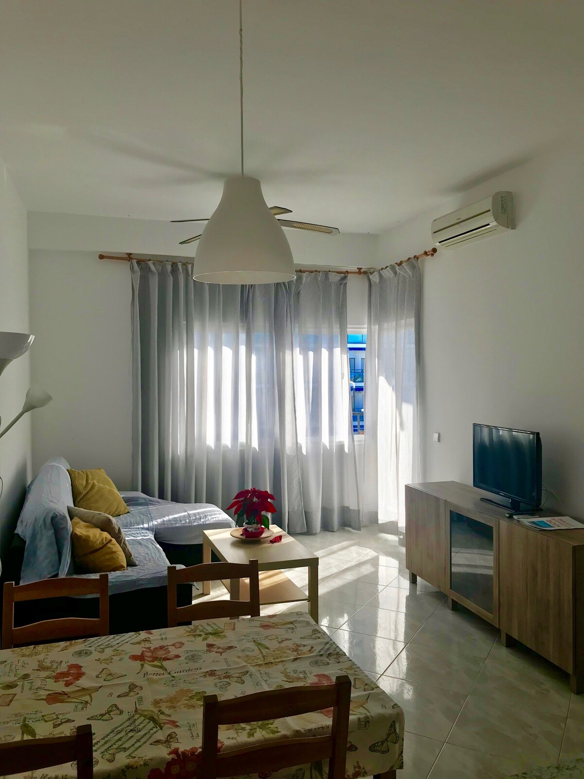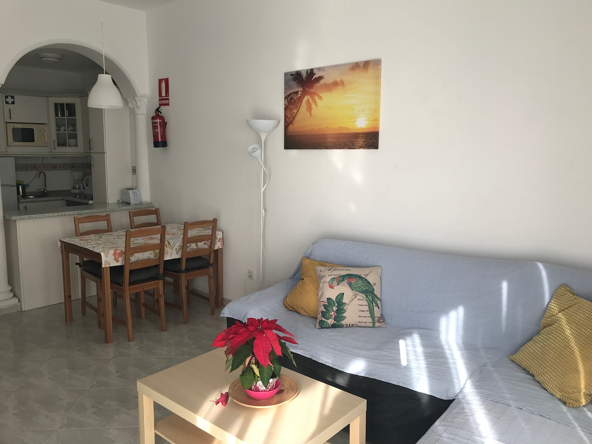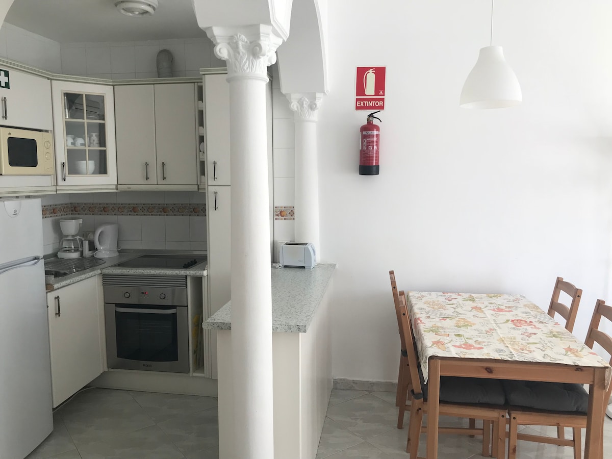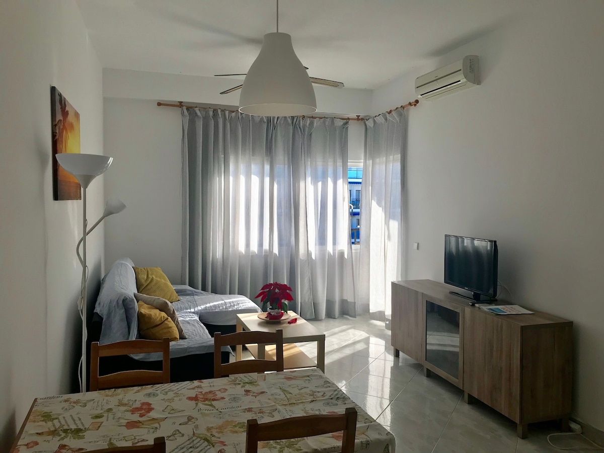 Skol Apartments Marbella - recently refurbished 1 bedroom apartment with 2 single beds and sofa bed in lounge, open plan kitchen, 4th floor, East facing with morning sun, terrace with views to the beach, pool and mature tropical garden. Fully fitted and equipped, the ideal spot for your holidays!Skol Apartments Marbella are self catering apartments set beachfront on central Marbella boardwalk with all services and amenities nearby. We offer a wide range of studios, 1-2-3 bedrooms apartments. They're all fully furnished with equipped kitchen as well as air con, heating, wifi, balcony with sea views, welcome pack and 24/7 reception and attention.