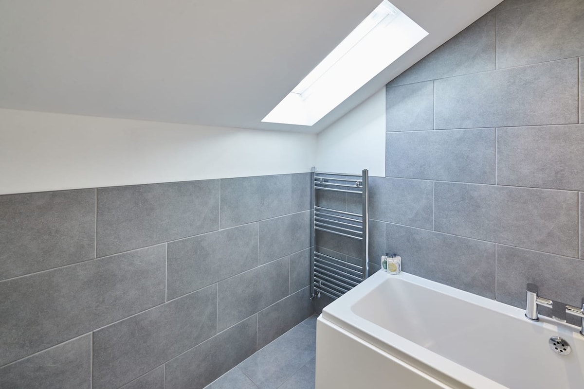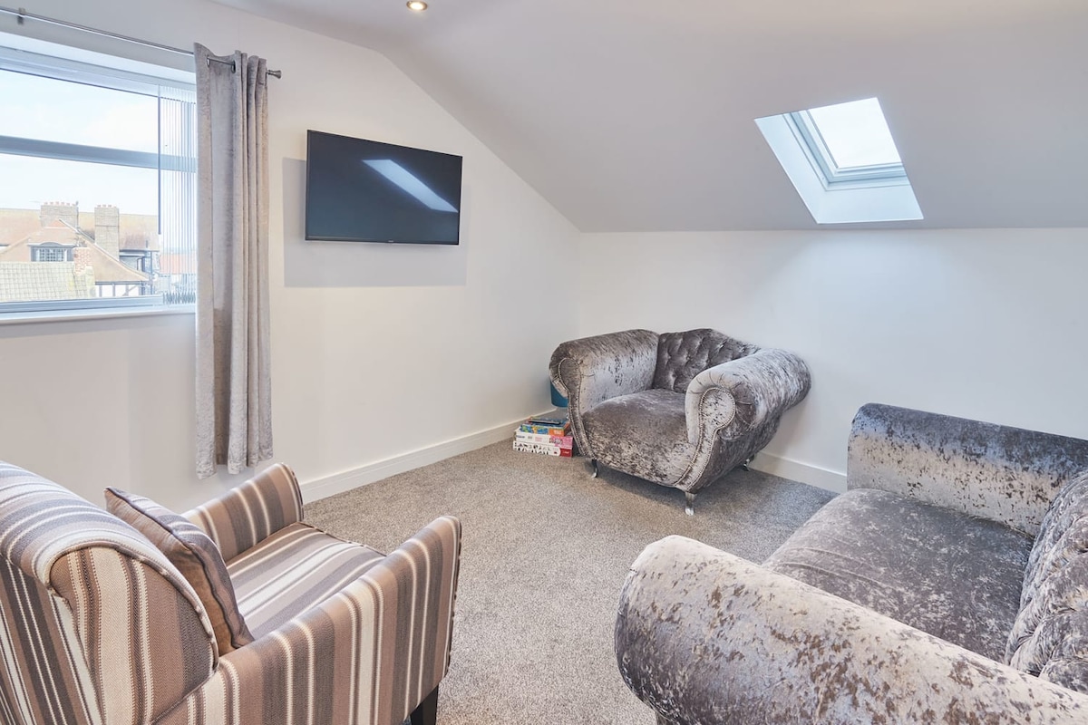 The living room space is simple in its decor. With skylight windows allowing for natural light to flood into the space and a plush fabric sofa with two armchairs, it's perfect for relaxing. Plus it boasts a flat-screen Smart TV - ideal for relaxing after a day exploring all that the area has to offer.