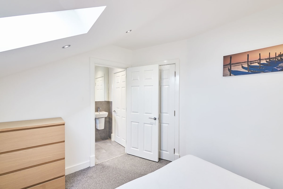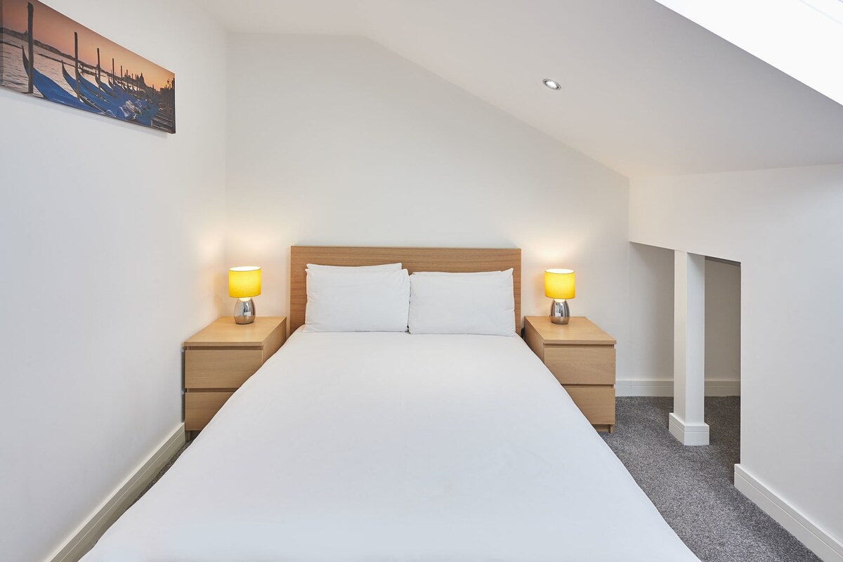 The second bedroom features a neutral colour scheme. The double bed sits neatly in the centre of the room, and like the first bedroom, also features bedside tables on both sides and lamps. You’ll also have access to an ensuite shower room in this bedroom.