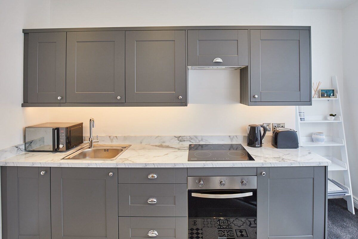 LIVING AREAApartment 2 @ Queens Court has a bright living area with a grey sofa, a flat screen TV and an overall light feel. Bright and neutral, it is a comfortable space for relaxing. A sofa bed can also be made up upon request, increasing the occupancy to four.