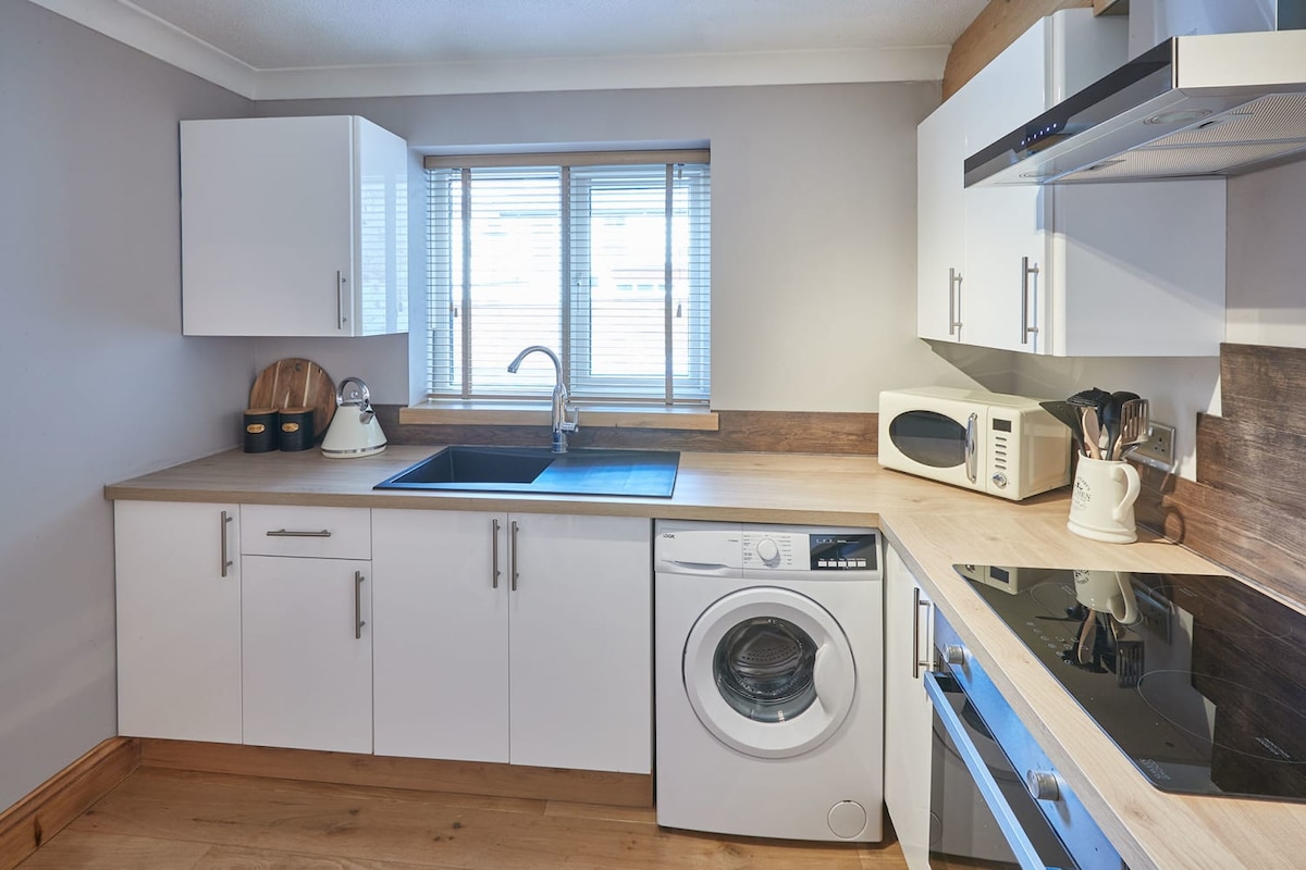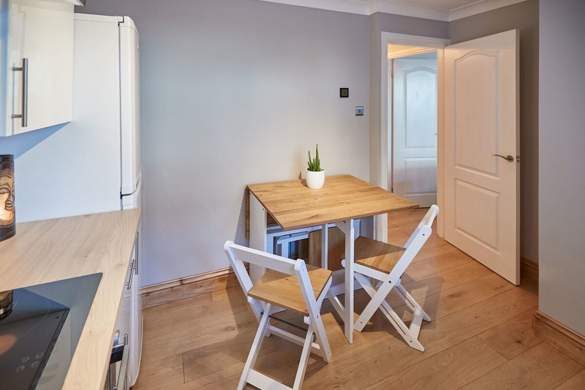 The apartment has a fully equipped kitchen diner. With modern appliances and cookware, you can prepare home cooked meals easily during your stay.