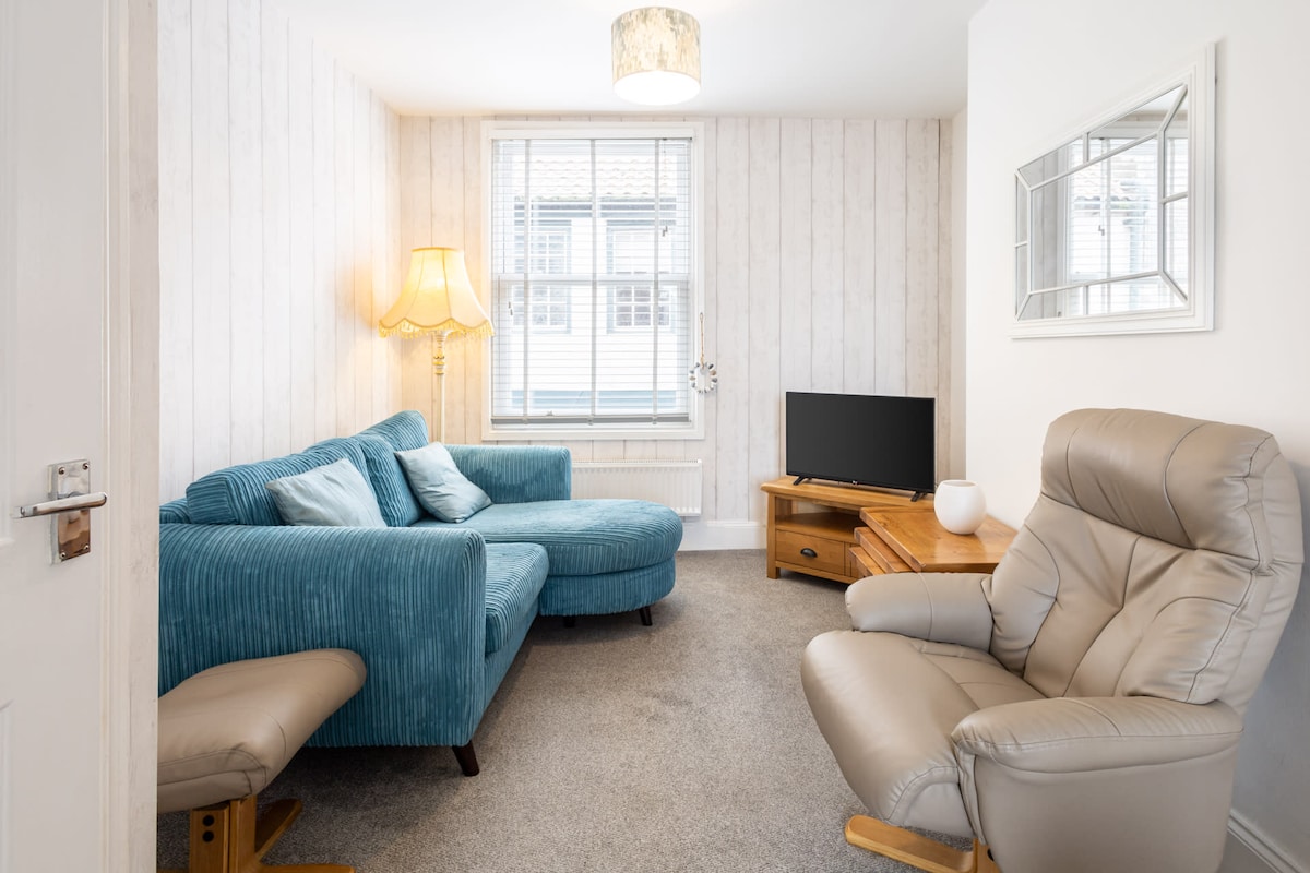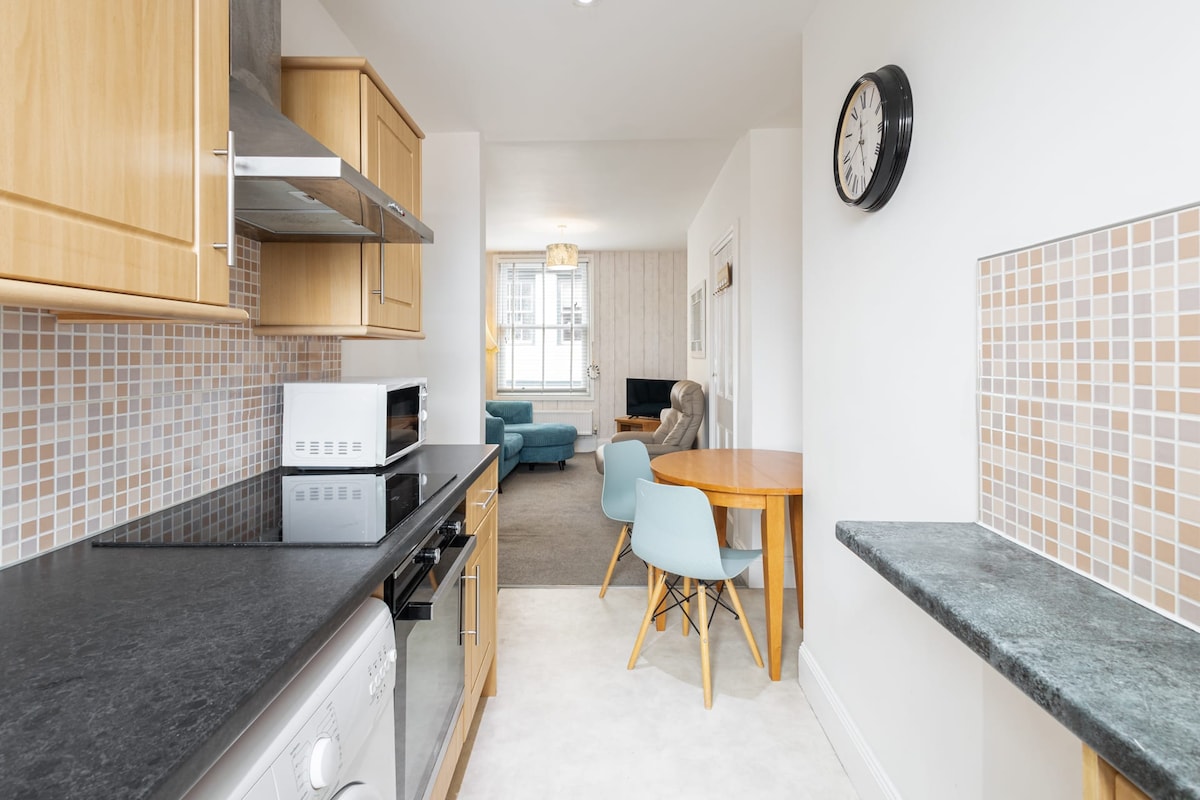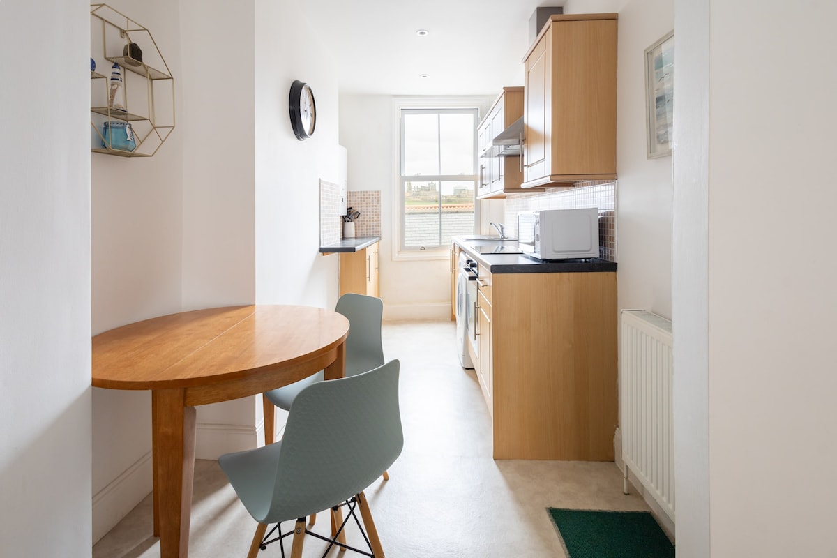 Abbey View is located in the centre of the bustling seaside town of Whitby. The Apartment has a lovely coastal character, with a cool and calming colour palette.Abbey View has an open plan kitchen and living area. With a comfortable light blue sofa and a TV, it’s the perfect place to relax on an evening.