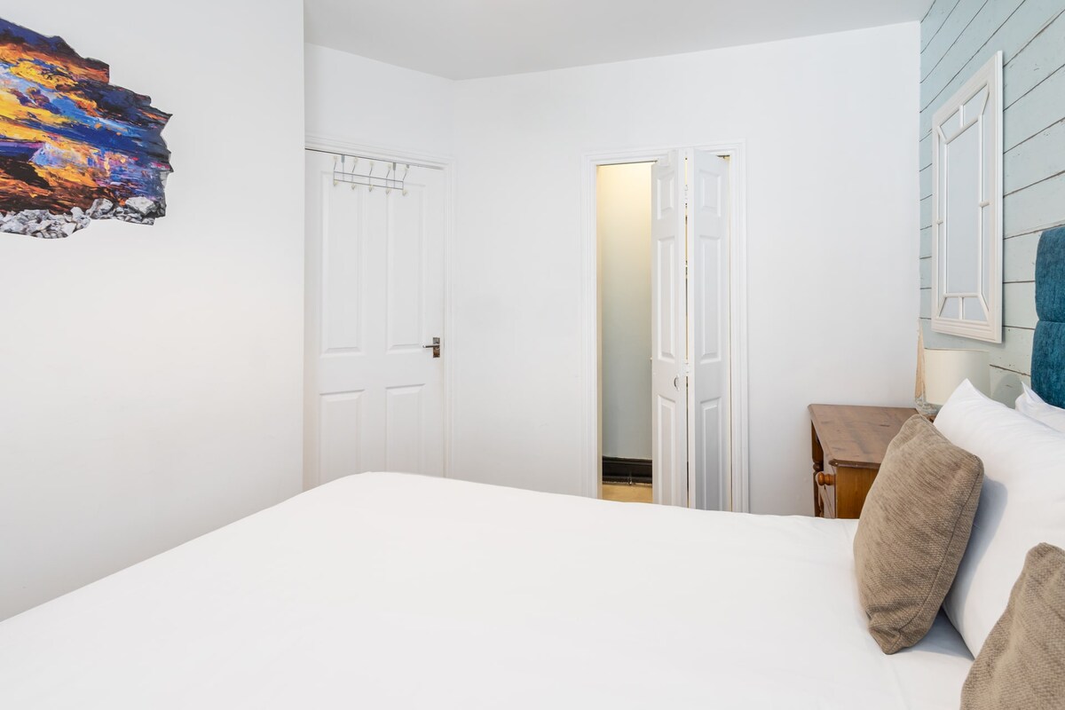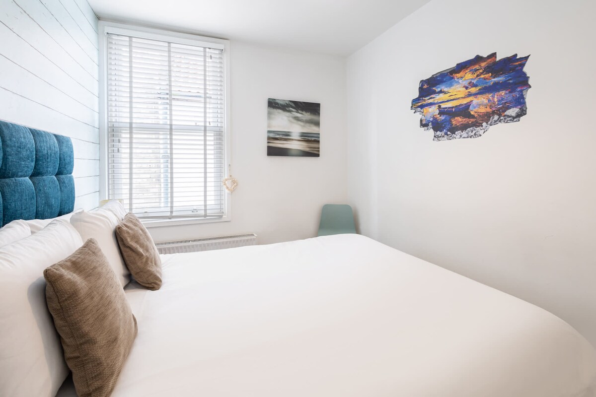 Head to the bedroom and you’ll find a spacious room with classic seaside styling. There is a double bed with premium bedding to ensure you have a blissful night's sleep. Bedside tables and lamps complete the space.