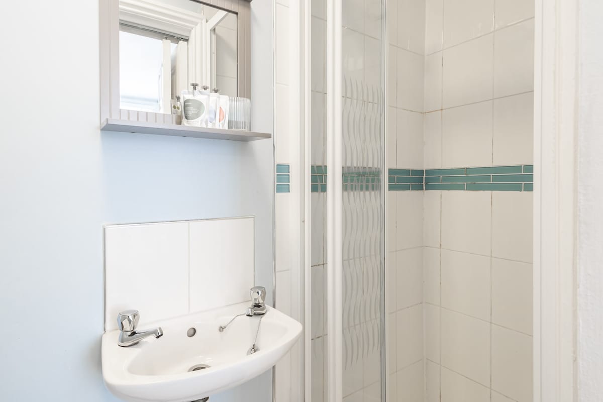 The ensuite bathroom has a walk-in shower, WC and wash basin.