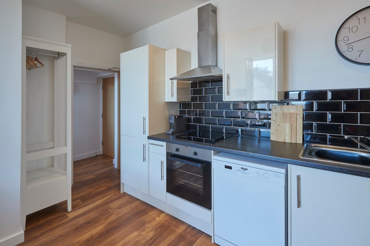 The kitchen area is well equipped for self-catering stays. Dominated by striking black tiles and white cupboards, the kitchen is fitted with essentials such as dishes, crockery and modern appliances including an oven and hob, kettle, microwave and dishwasher.