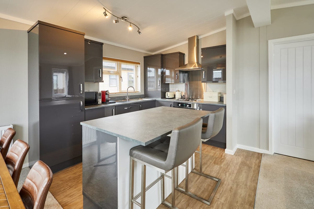 Fully equipped with modern appliances and cookware, the kitchen has everything you could need to make the most of your self-catering stay. Beautifully styled, the high-shine kitchen is dark grey in colour and there is a large dining table with comfy dining chairs, along with a separate breakfast bar.
