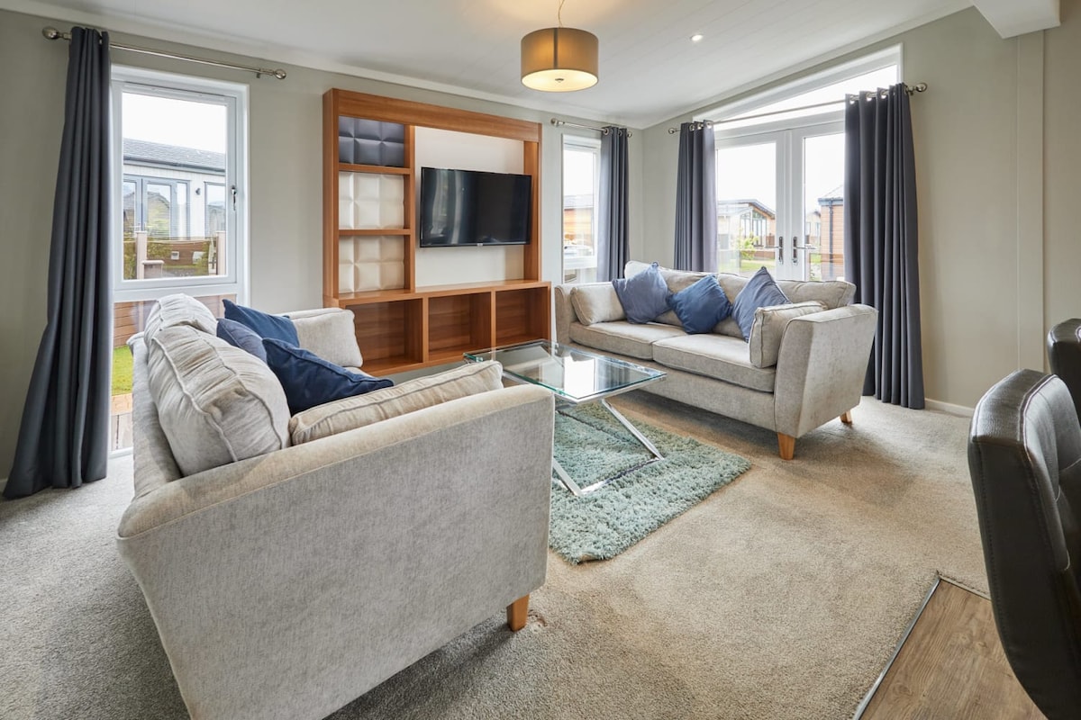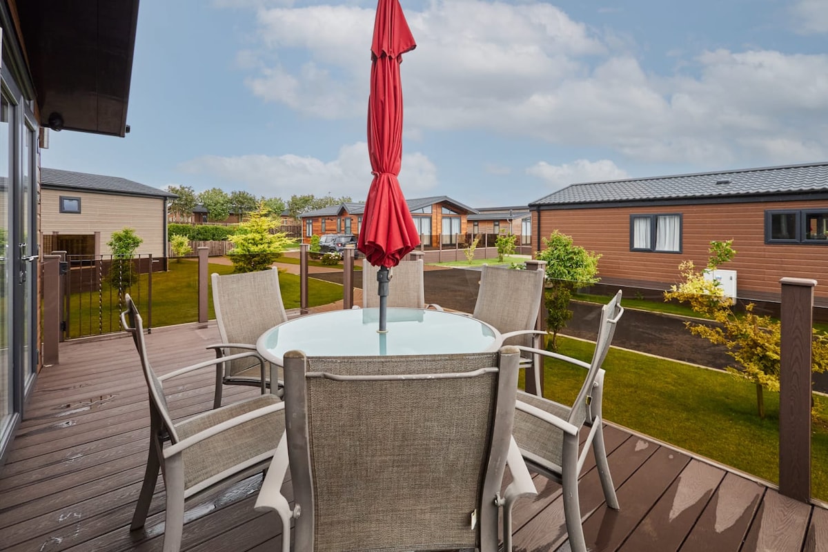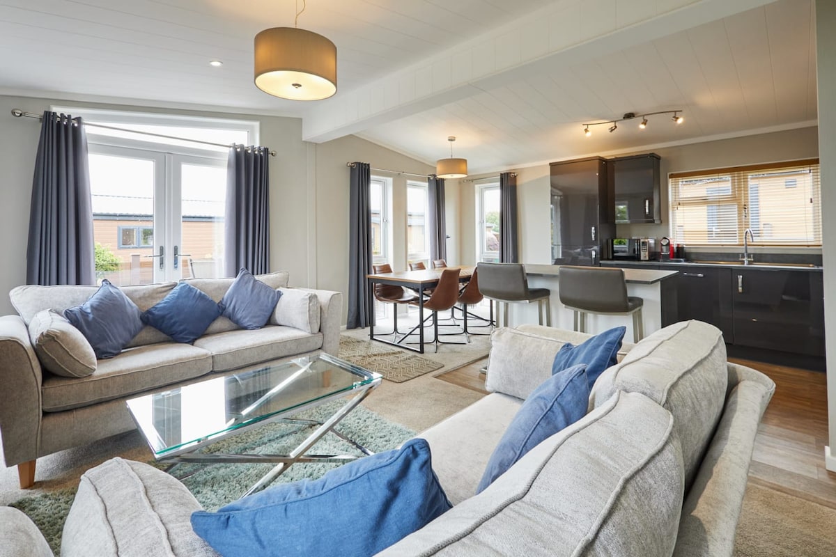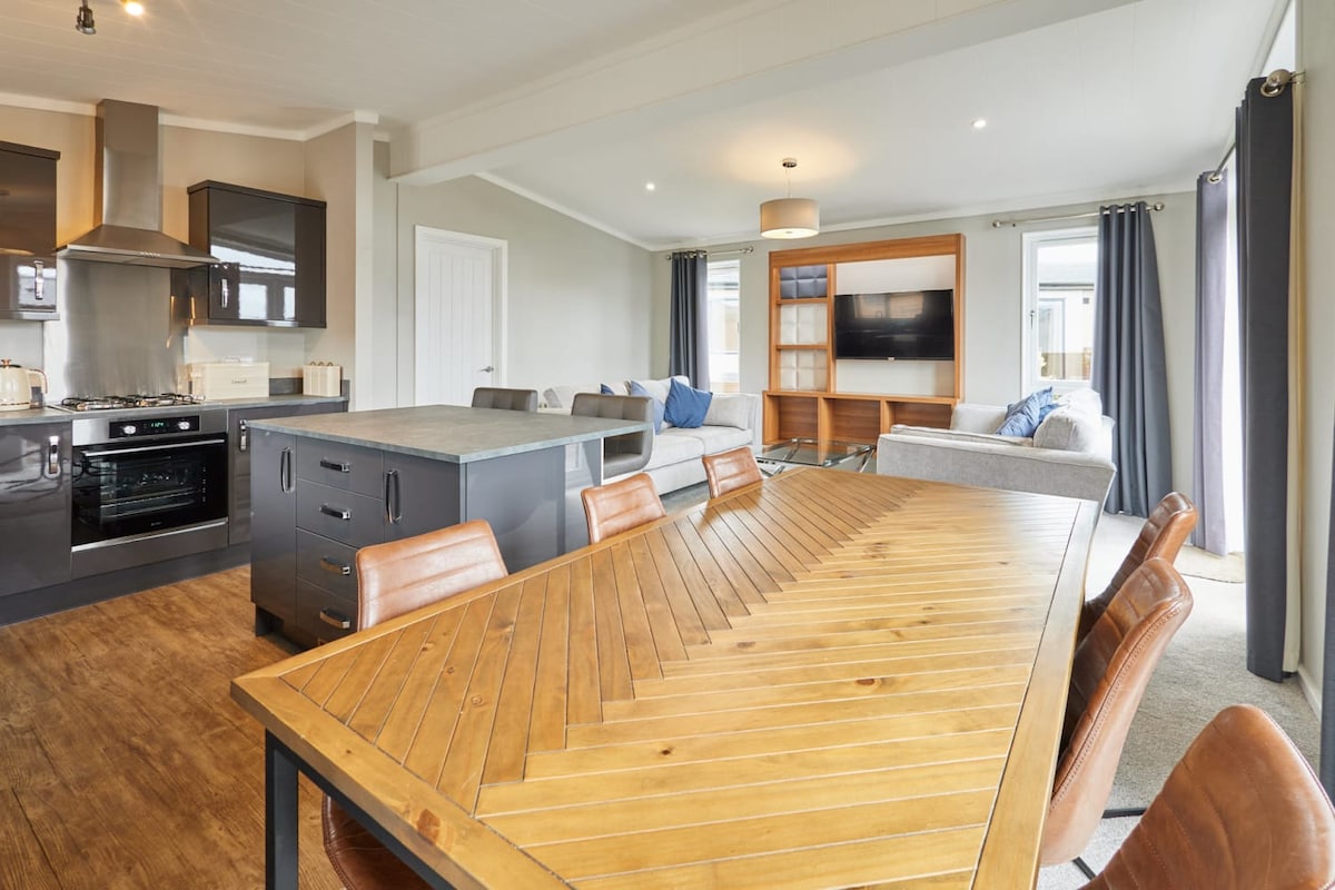 19 The Pines boasts a large open plan living, kitchen and dining room with patio doors which open out onto a decked terrace. Set in beautiful surroundings, the terrace is the perfect place to start your day! Enjoy your morning coffee as the sun rises in the distance or wind down here after a busy day exploring the coast.There is ample seating in the living area and a TV with streaming apps so it’s the ideal spot to cosy up with your loved ones.