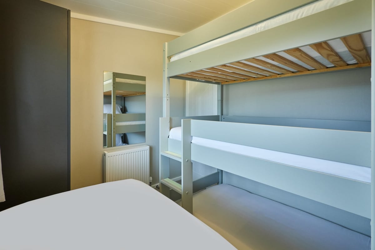 The second bedroom features a double bed. The third bedroom has a triple bunk bed, and the space also includes a separate single bed which is always made up.