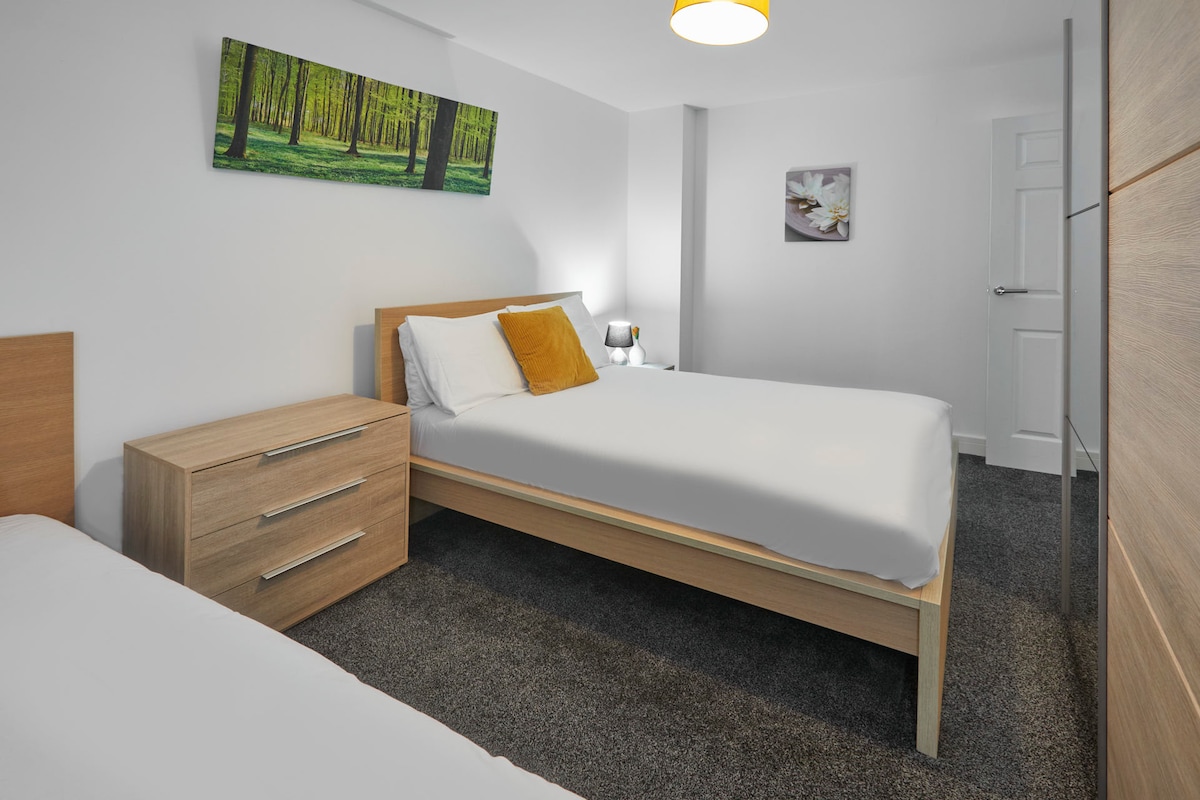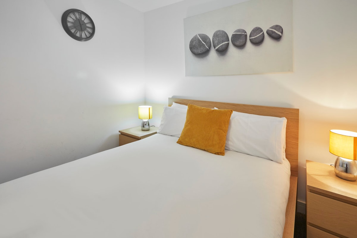 The apartment has two bedrooms. Head to the master bedroom and you’ll find a tranquil space with a double bed and ample storage space along with bedside tables and lamps.