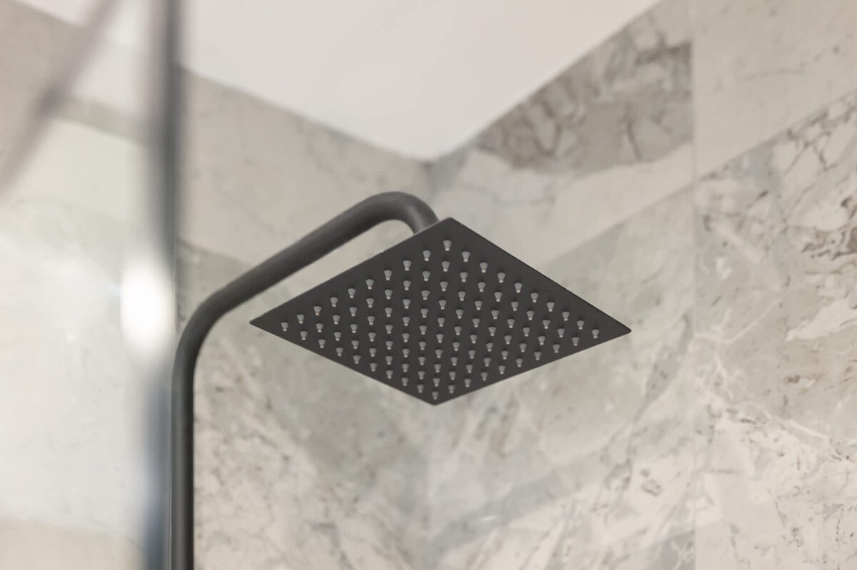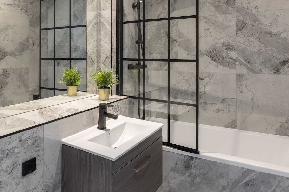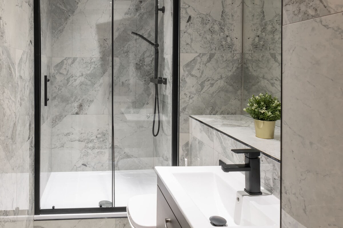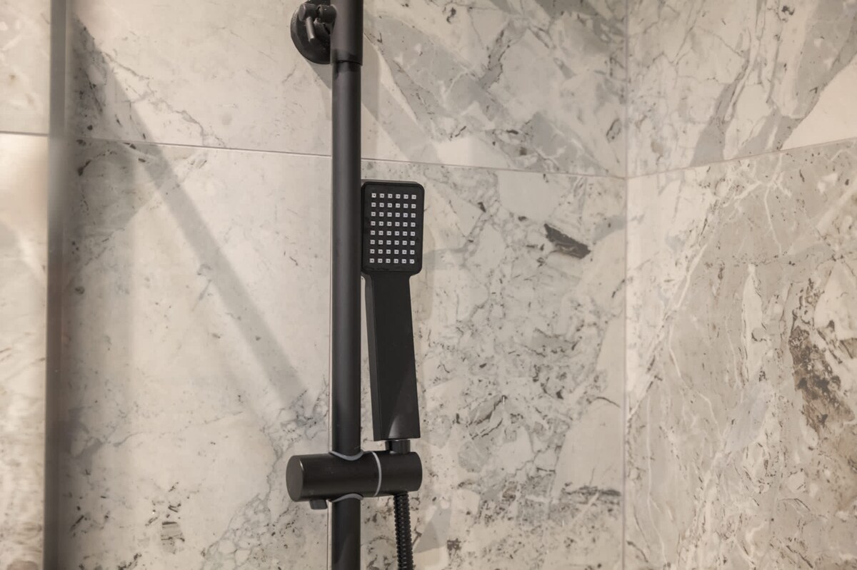 Next to these bedrooms, you’ll find two sparkling clean bathrooms positioned opposite each other. Each bathroom features grey tiles and includes large mirrors, white WCs, and wash basins. The larger bathroom has a bathtub with the option to use either a handheld or rain shower, while the smaller bathroom offers a shower cubicle equipped with both handheld and rain shower options.