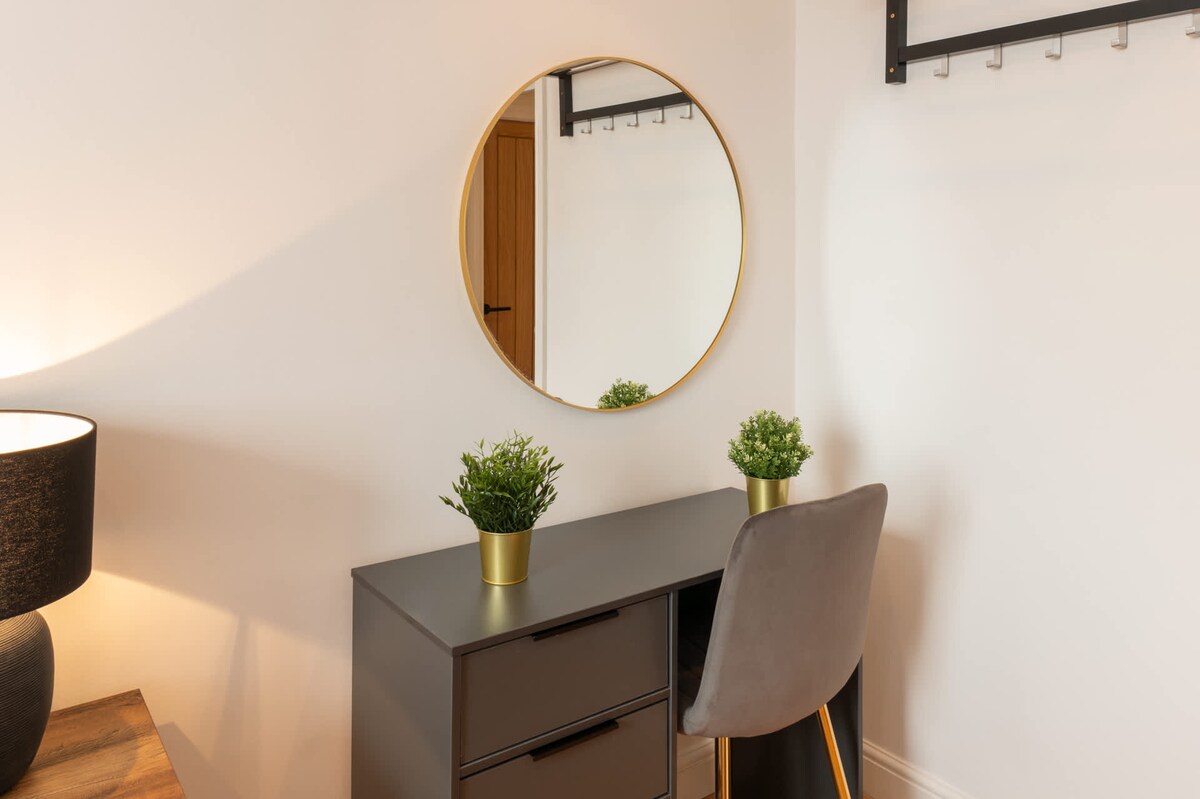 Princes Place Hideaway IV is a stylish three-bedroom, two-bathroom apartment featuring a modern yet charming design. The space is bright and airy, with a white interior throughout, enhanced by sophisticated wooden accents including the doors, floors, and furniture. These natural tones are elegantly complemented by pops of amber, blue, and grey, adding a touch of vibrancy to the overall aesthetic.Upon entry, you will find two bedrooms on the left-hand side. The first bedroom offers a double bed, while the second boasts two double beds, featuring windows overlooking the beautiful neighbourhood. Each room has hanging racks for your clothes and desks that can be used for work or vanity.