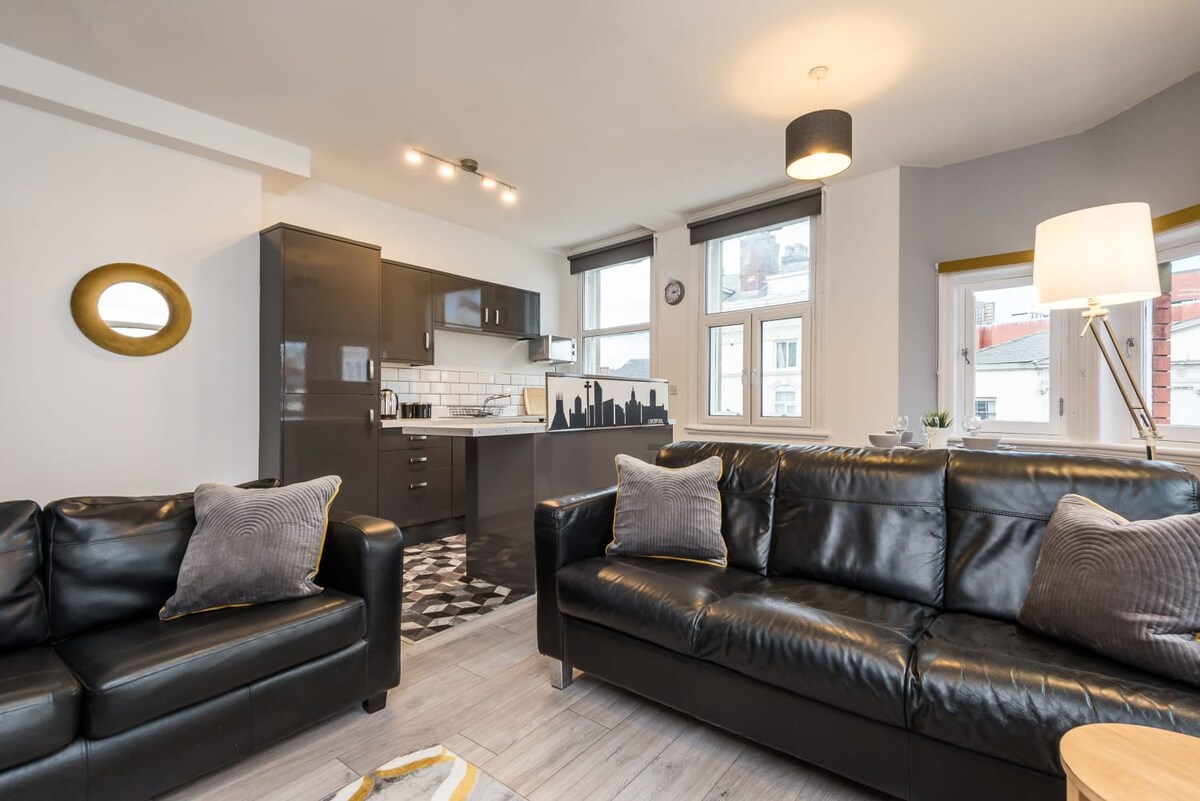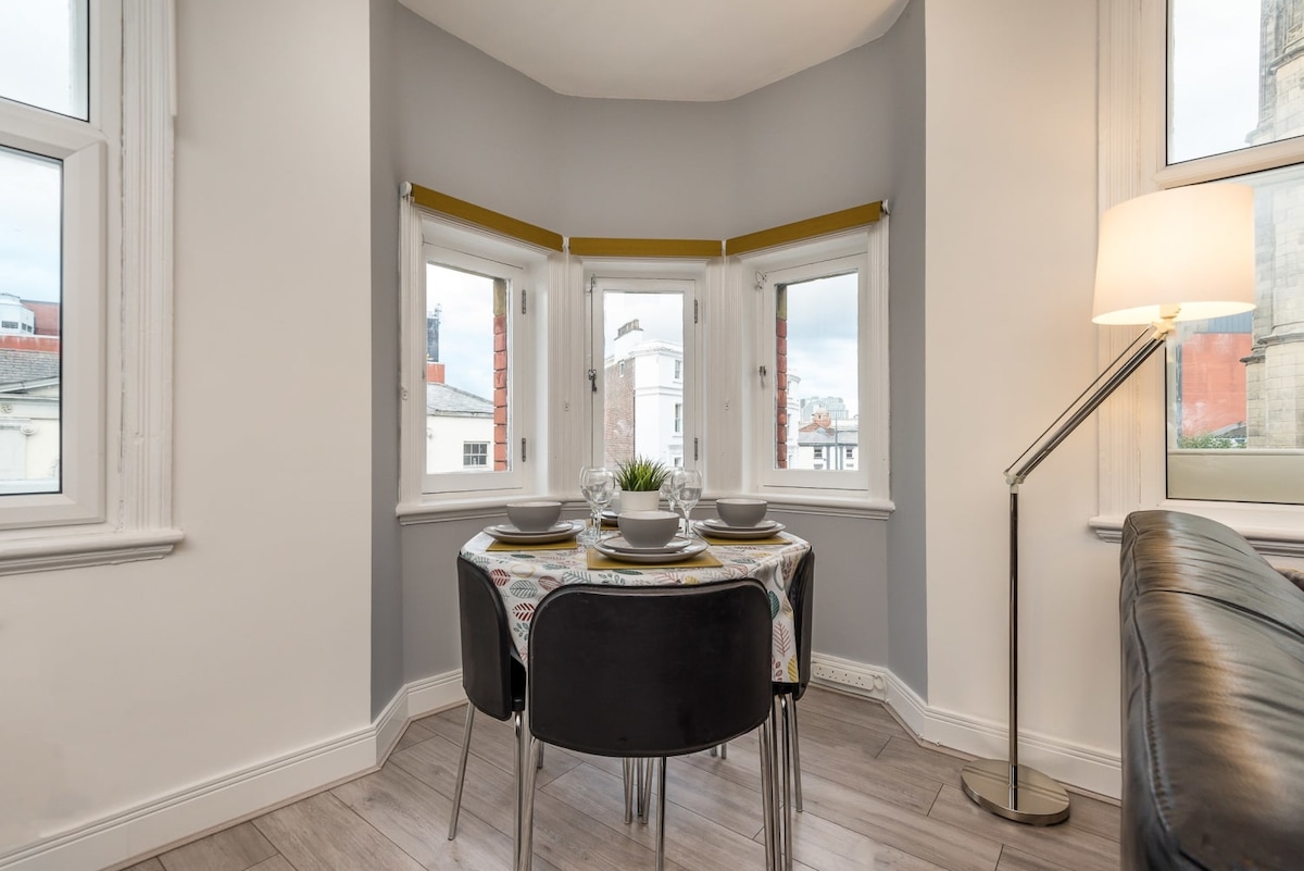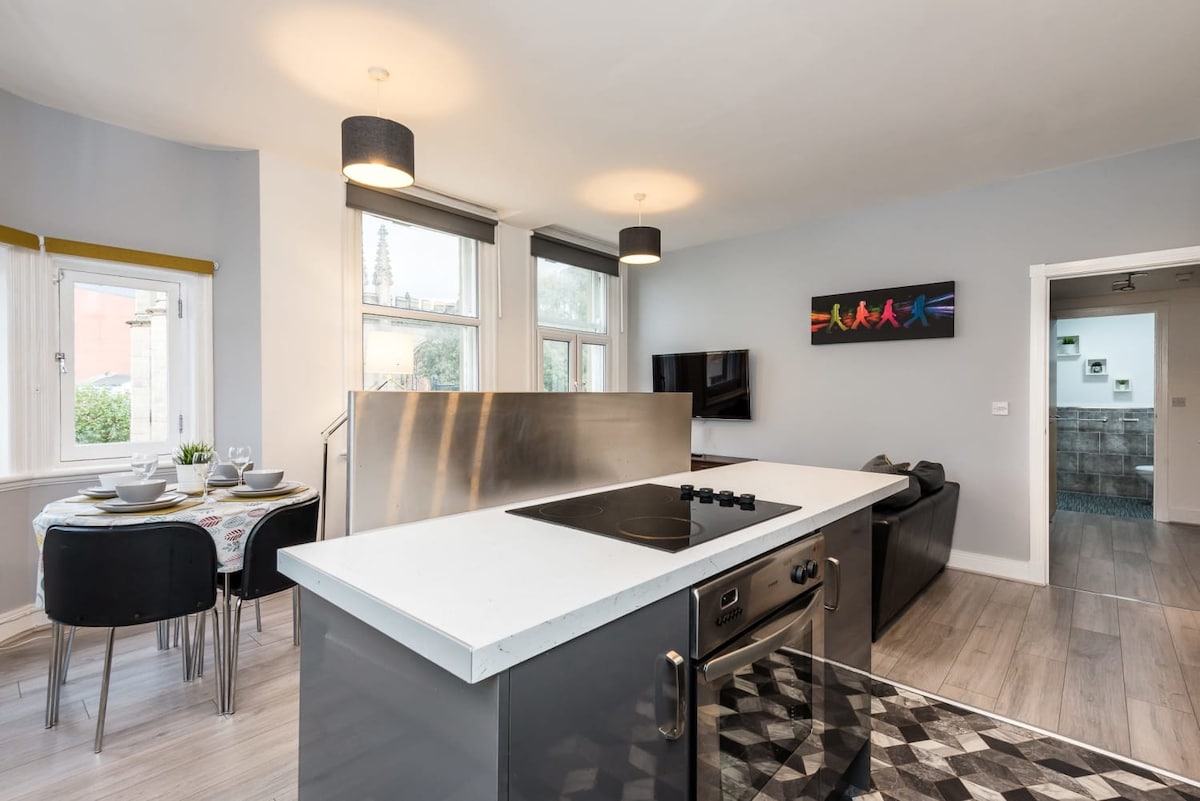 Reached by 2 flights of stairs, this apartment provides a snug and cosy feel for your stay. It has an open plan living/kitchen space with views of St Luke's Church, the kitchen is fully equipped with everything you'll need to cook up some delicious meals and the living room is the perfect place to wind down after a day of exploring! The living room has a double sofa bed, ready to sleep 2 guests.This apartment also has a comfortable double bedroom with a full length mirror and a chest of draws, and a spacious, modern bathroom.