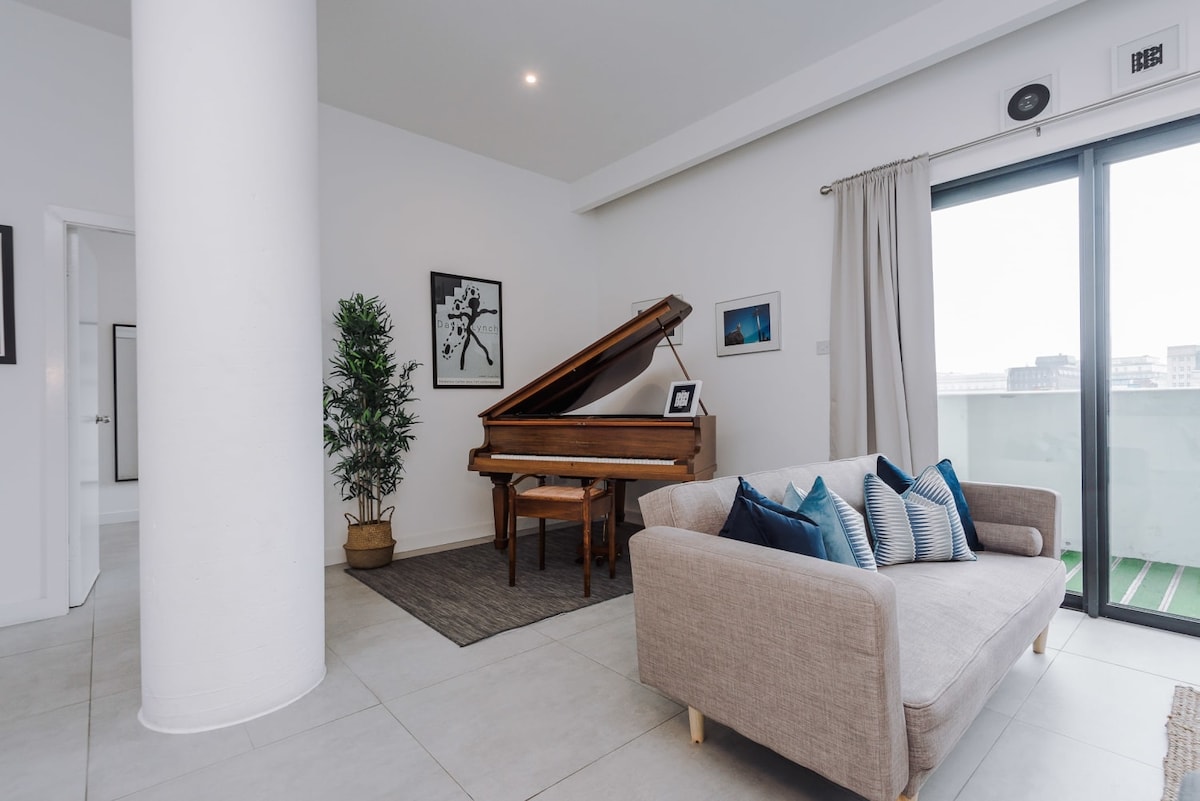 There is a large bedroom with a comfortable double bed, a huge open plan living/dining area for guests to relax in. The huge windows throughout provide plenty of natural light and great city views! The quirky music inspired decor makes it a truly unique place to stay! There is even a grand piano in the living room!Please note: The guitars are no longer in this apartment and we have installed curtains in the bedroom since the professional photography.