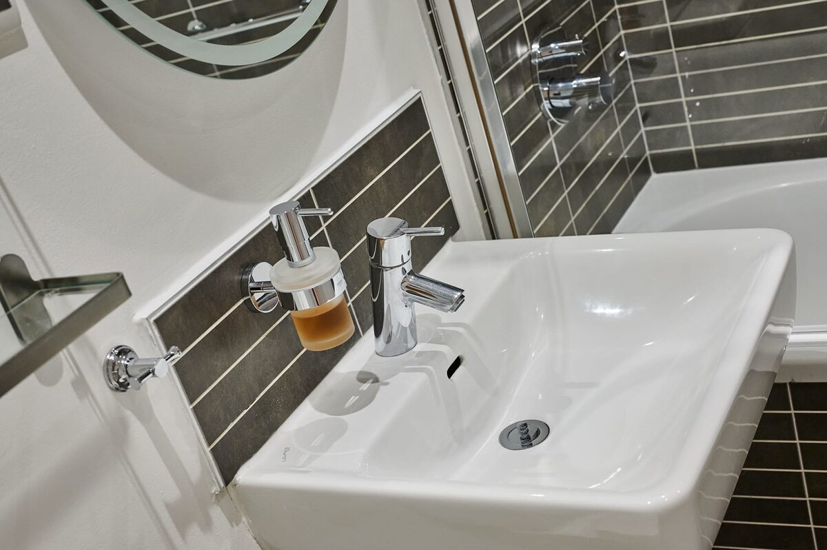 The family bathroom features a wash basin, a WC and a bathtub with an overhead shower.