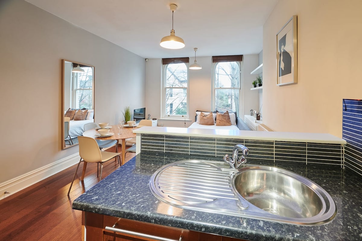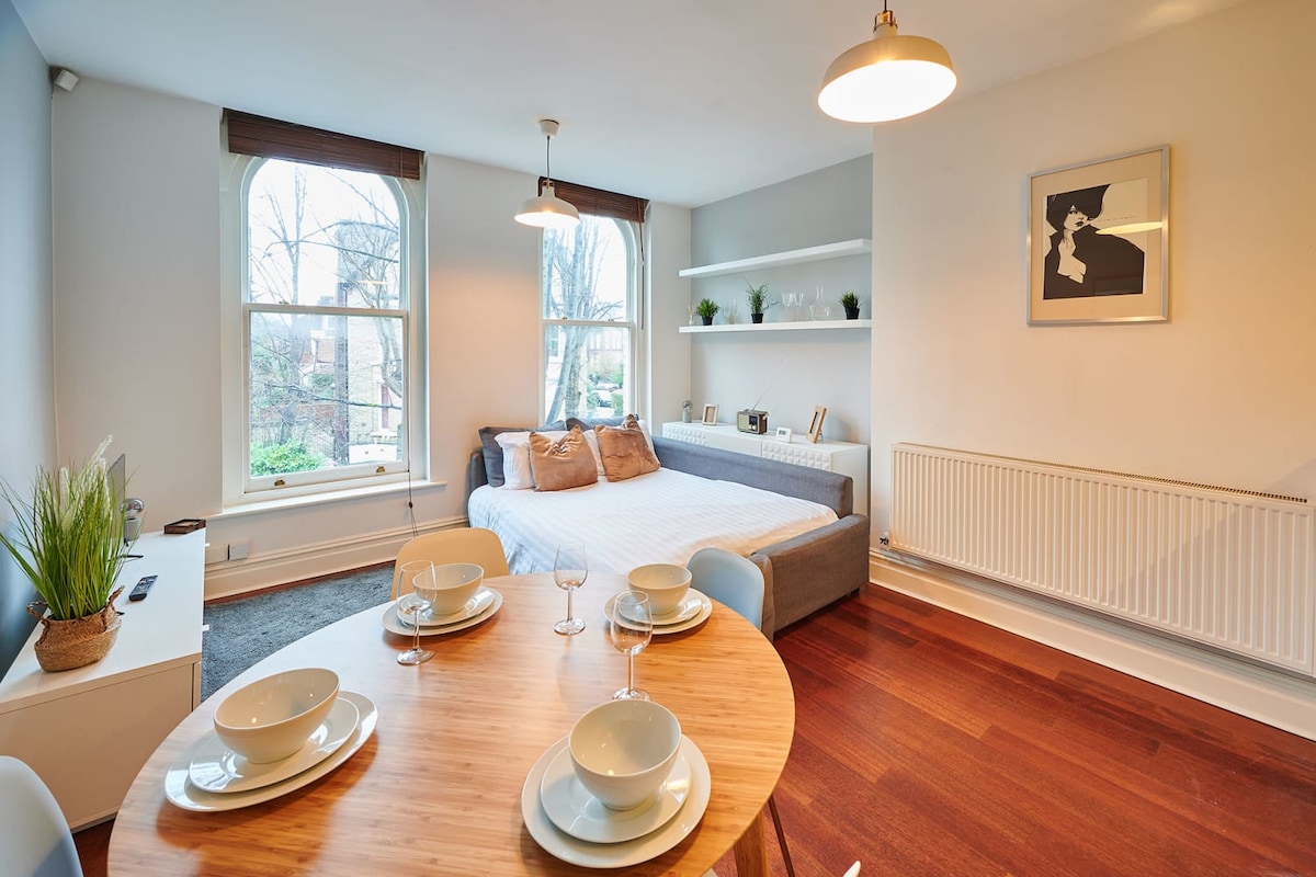 Great location, great stay, if you want cafes/pubs/restaurants on your doorstep, large park and easy bus routes to town. Flat is in an old building ,it could have done with an airing before our arrival, musty smell improved by day two. Otherwise clean, modern apartment. One negative,We could not check in on line until we paid £20 damage insurance, or £150 holding fee. Not spotted in original booking info.