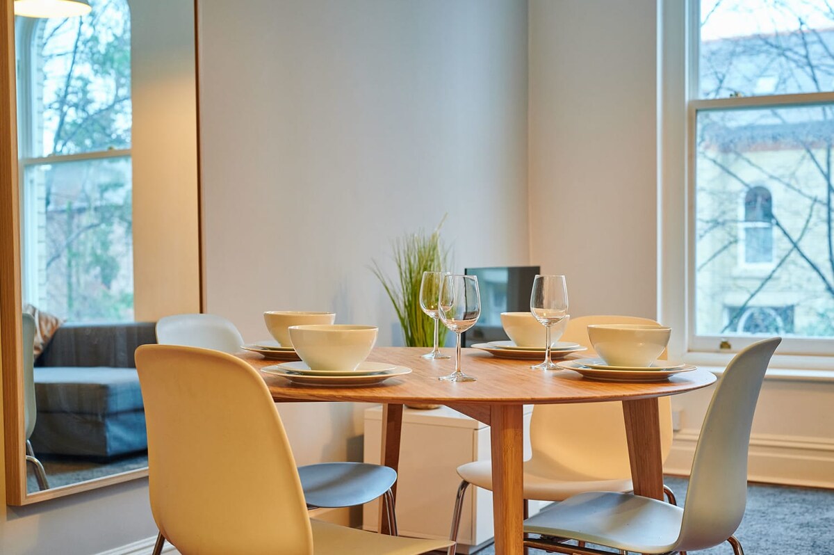 As you walk in, the door to your left leads to the open-plan living, dining and kitchen area. Boasting contemporary decor throughout, The Ivanhoe Retreat is beautifully designed with huge sash windows allowing tonnes of natural light, attractive wooden flooring and wooden kitchen cupboards. Perfect for home-cooked meals, the built-in kitchen features all essentials including an integrated fridge/freezer, oven, hob, microwave, Nespresso coffee machine and more! A washing machine is installed in the kitchen and is free to use for your stay.