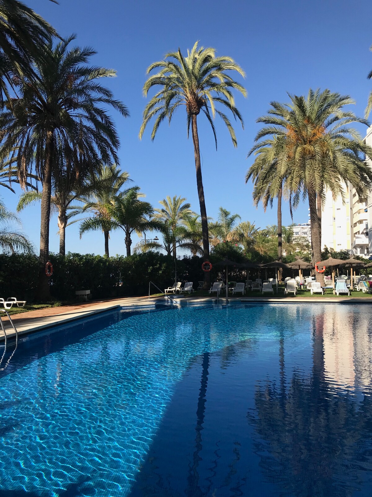 Las instalaciones del edificio son muy buenas, 2 piscinas muy agradables y muy limpias con un entorno lindo, el problema es que no se permiten toallas en el pasto por lo que si no arriendas una reposera no te puedes sentar ni acostar en la piscina y para conseguir una reposera te tienes que poner a la fila a mas tardar a las 9/30 am ya que abren a las 10 y no hay muchas disponibles y la fila es larga.