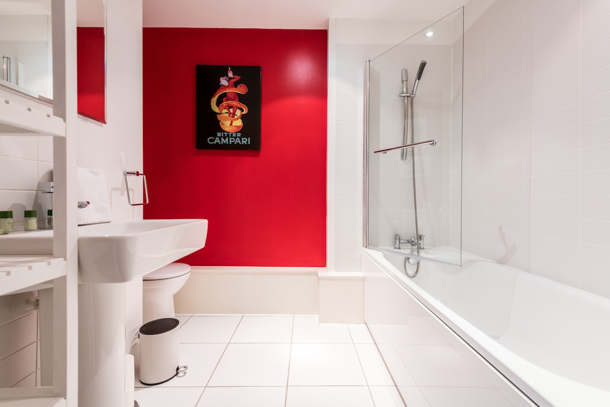 The fully equipped contemporary kitchen comes with an oven, microwave, toaster and kettle. Start the day right with our Nespresso machine with pods provided. With dining space for 6, our apartment is ideal for a night in cooking or a hearty breakfast before a day exploring the city.