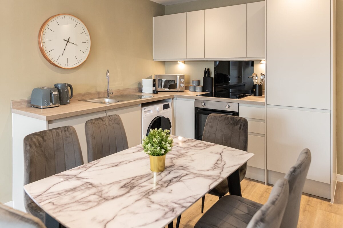 With two ensuite double bedrooms, a fully equipped kitchen, and an open-plan living and dining area, Richmond Place Apartment is perfectly suited for weekend getaways and corporate stays.Upon entering, the first room you'll see is the kitchen area, which is equipped with high-spec appliances such as a dishwasher, a washer/dryer, an electric hob, oven, an integrated fridge/freezer, a kettle, a toaster, a microwave, and a Nespresso coffee machine.
