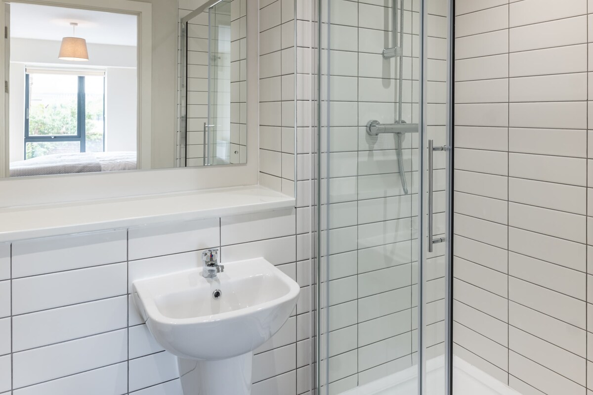 Richmond Place Apartment boasts two double bedrooms, each with an ensuite bathroom fitted with a WC and washbasin. One has a shower room, while the other features a bath with an overhead shower.