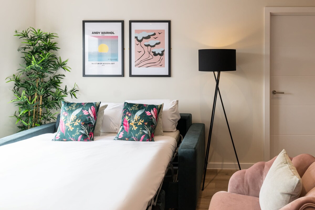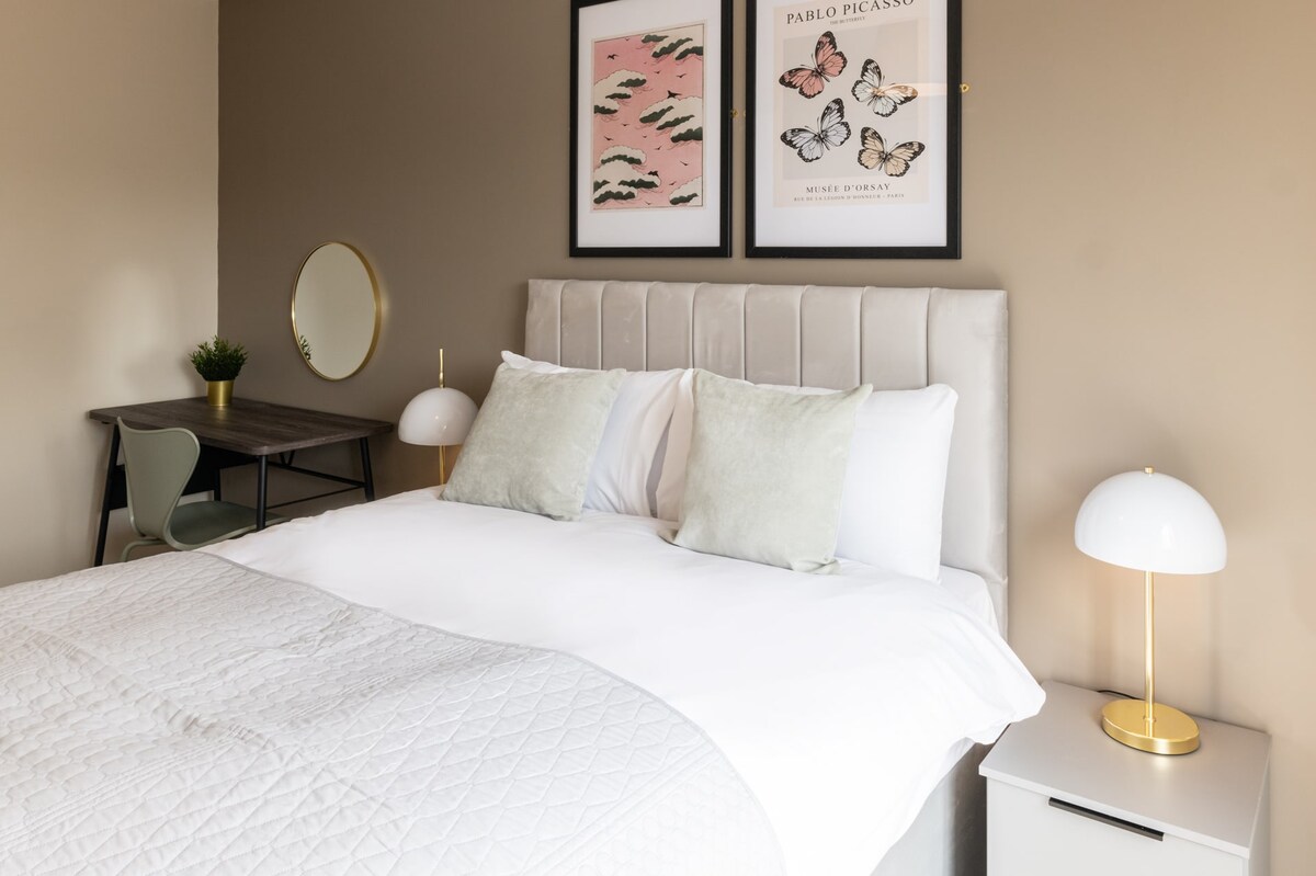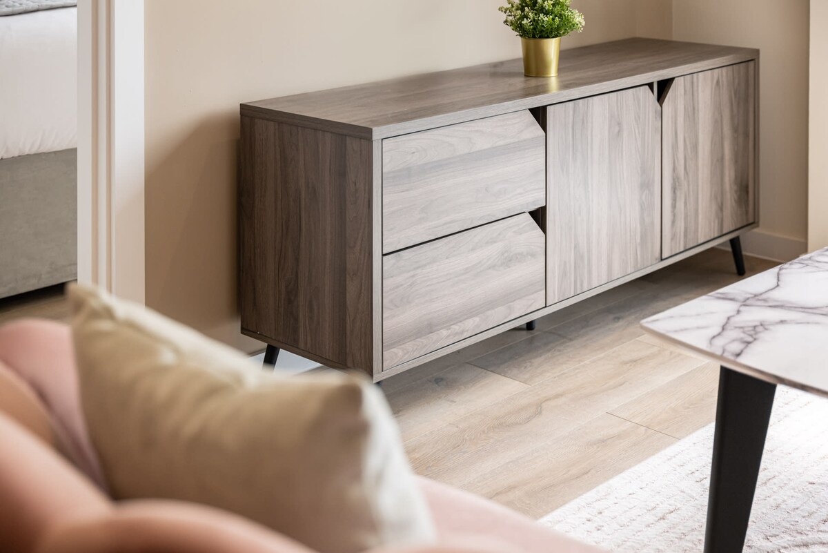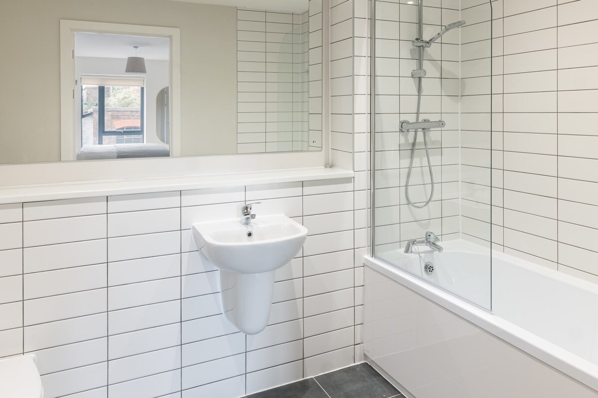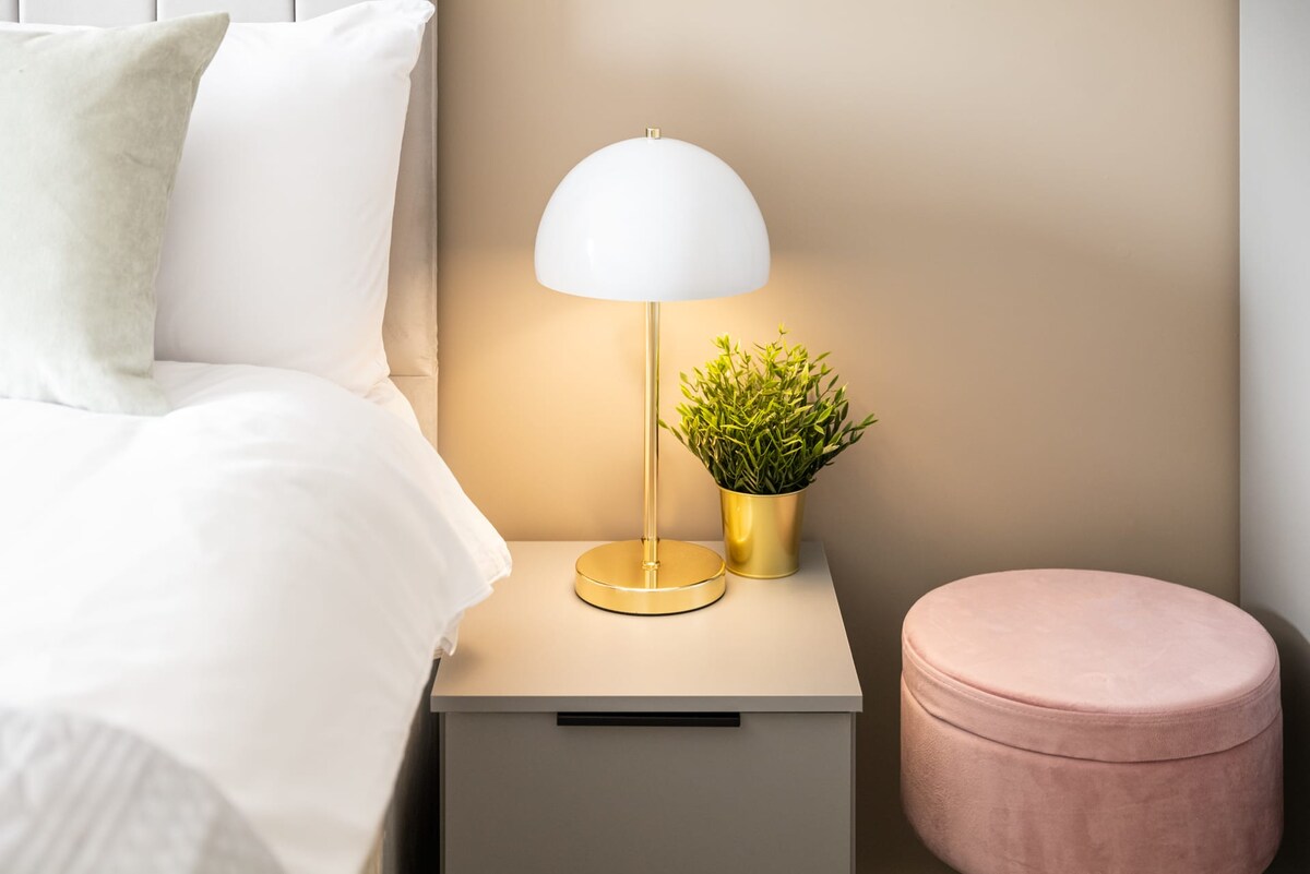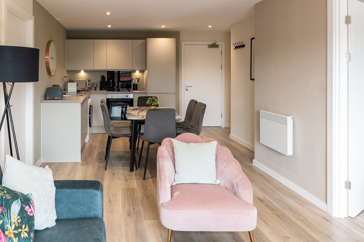 Richmond Place Apartment is a recently furnished two-bedroom, two-bathroom apartment nestled in the north of Liverpool. It's the ideal retreat for those seeking to enjoy the natural surroundings in Everton or to explore city life and sports activities, with the city centre and Anfield just moments away! Richmond Place Apartment boasts a grey and white interior design with a subtle addition of pink elements to create a cosy ambiance.