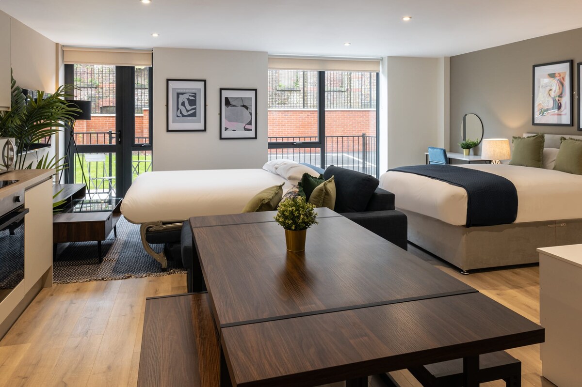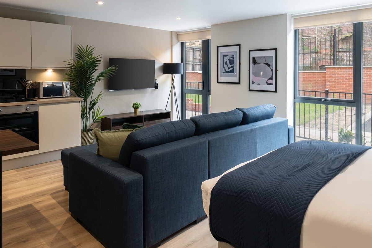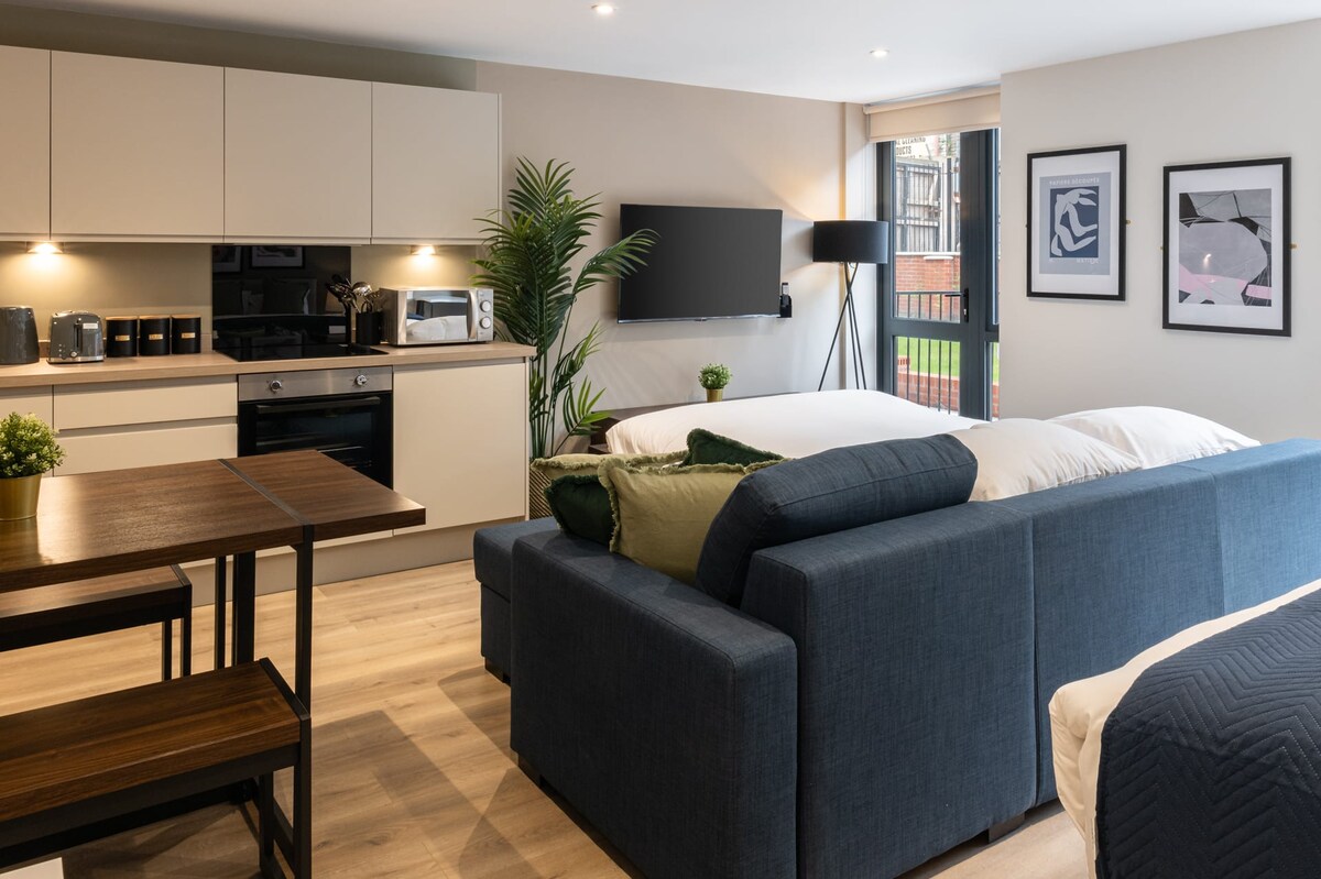 Richmond Place Apartment offers a snug studio setting, recently renovated to meet the highest standards of serviced accommodation. Complete with a fully equipped kitchen, a comfortable double bed, and a clean bathroom, it's the ideal accommodation choice!Fitted with a wall-mounted Smart TV in the living area which offers entertainment options such as streaming apps, terrestrial channels or Freeview TV. The double bed is conveniently located behind the corner sofa which also converts to a double bed.