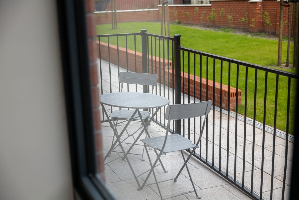 You'll also have access to a small patio with bistro chairs and a table, offering a lovely view of the green grass in the garden.