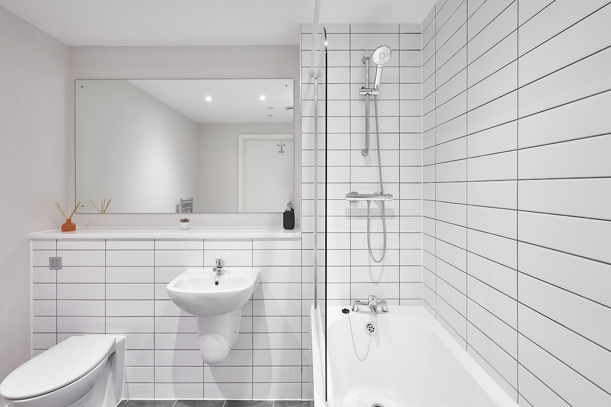 The first bedroom has a minimalist look with white furnishings, including bedside tables and a wardrobe, beautifully complemented by grey hues on the bed and simple, elegant wall prints. The ensuite bathroom includes a WC, a washbasin, and a bathtub with a shower overhead.