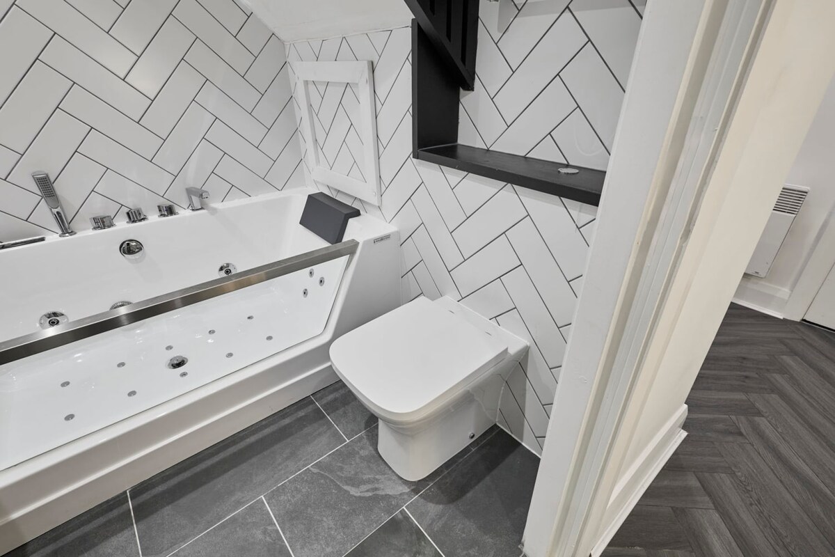 The bedroom is located on the lower floor and fitted with a super king-size bed sleeping two guests comfortably. The modern bathroom with its a white and black interior is right next to the bedroom. Fitted with a toilet, sink, and a shower over the Jacuzzi bath which fits two people, you couldn't ask for a better romantic trip.