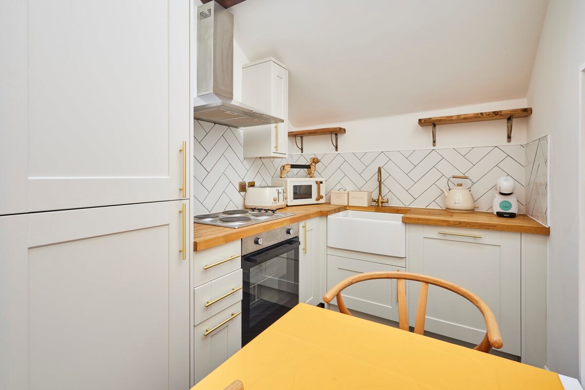 The open-plan living, dining and kitchen area is on the upper floor. A small double sofa bed is provided which can sleep up to two people. The kitchen is fully equipped with all crockery, pots, pans, and appliances such as a microwave, kettle, oven, hob, toaster, dishwasher, fridge/freezer, coffee machine and more. A washing machine is also provided - you have everything you need for a comfortable stay.
