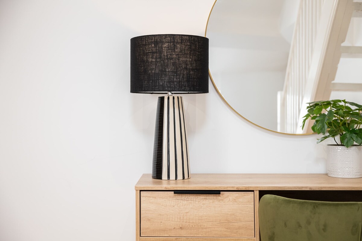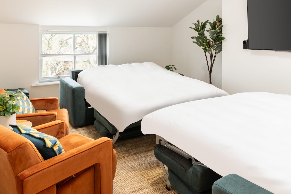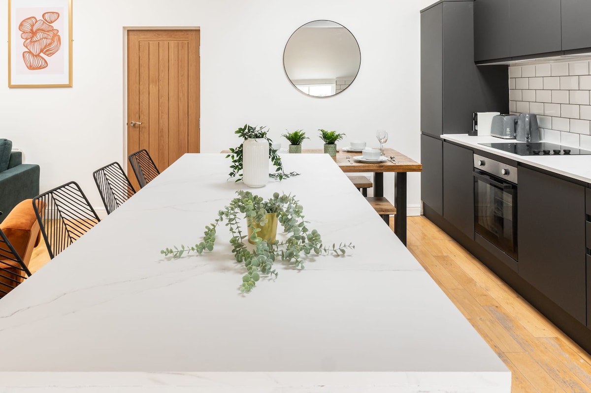 Princes Place Hideaway V showcases a sophisticated open floor plan living area which blends comfort with modern design.The apartment has a welcoming living space decorated with contemporary furnishings and a wide-screen Smart TV, perfect for unwinding after a busy day out. The living room also features two comfortable sofa beds, providing additional sleeping arrangements for four guests.