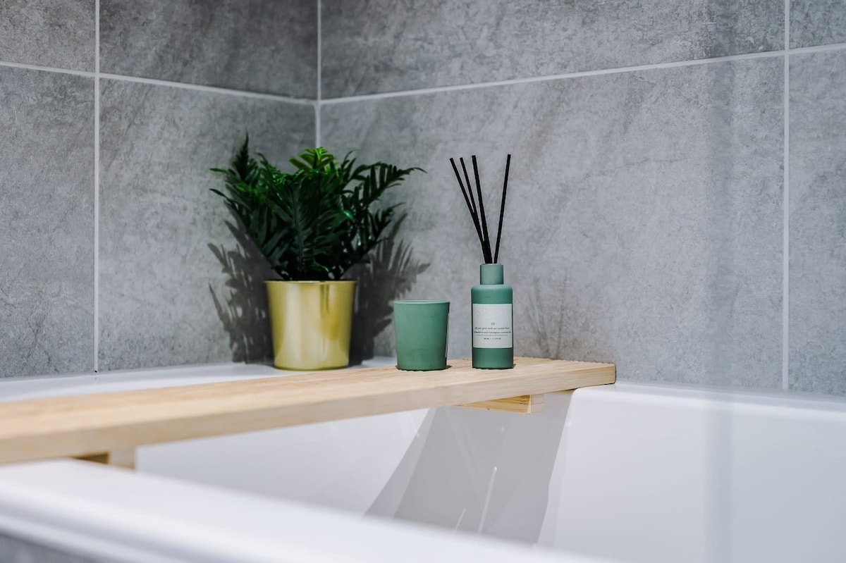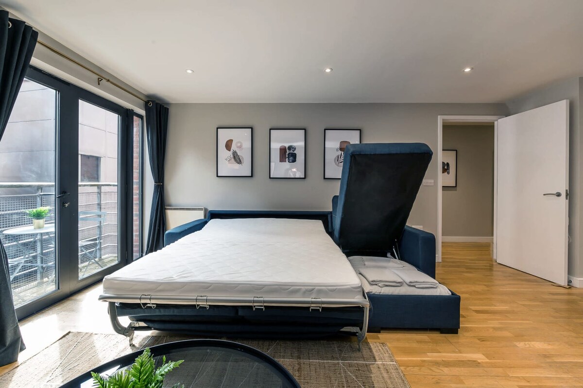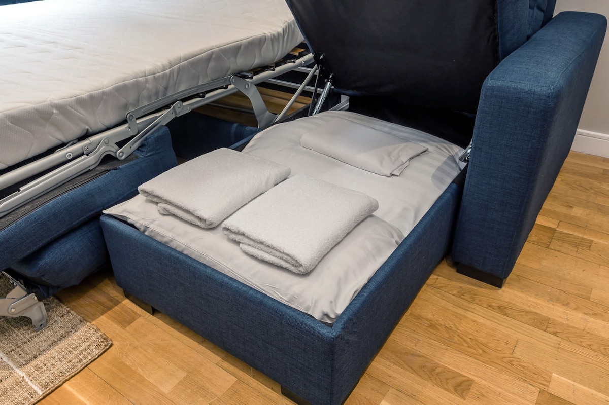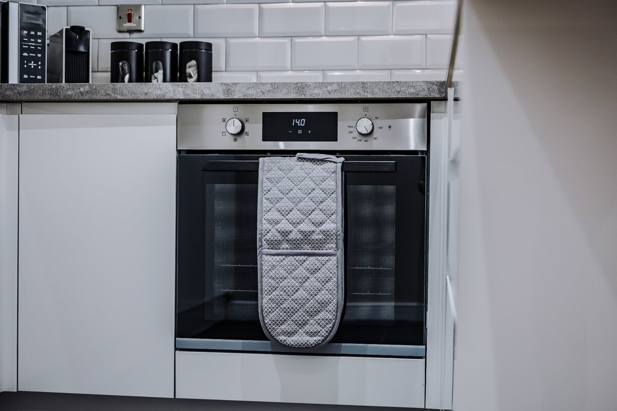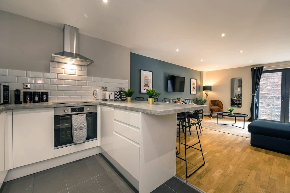 This contemporary apartment houses two private bedrooms each fitted with a comfy double bed - one of which is huge enough to fit another sofa bed. Alongside this, the apartment boasts a spacious living area with a double sofa bed, ideal for groups to relax and unwind! There is also a travel cot in this property so that the whole family can enjoy their stay safely!The stylish, bright kitchen has all the utilities you will need for your stay, including a Nespresso coffee machine, dishwasher and all the cooking amenities you will need to treat yourself to a home-cooked meal.