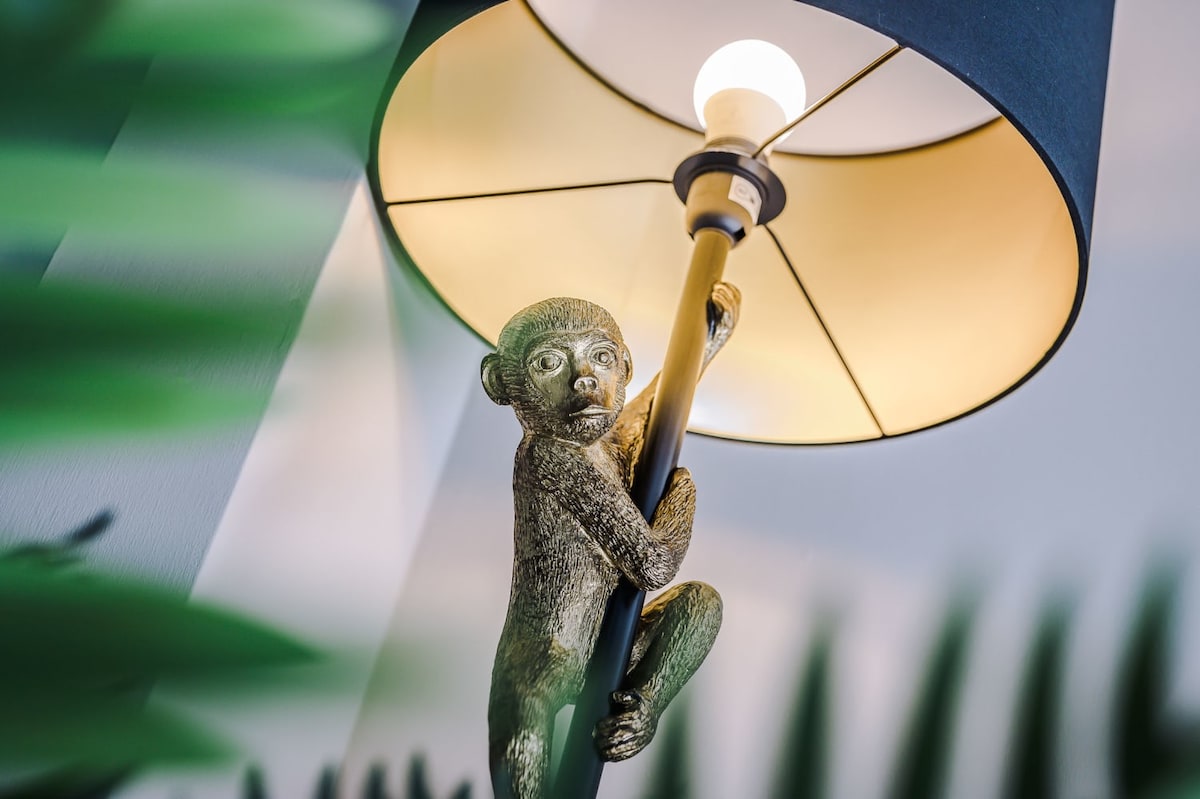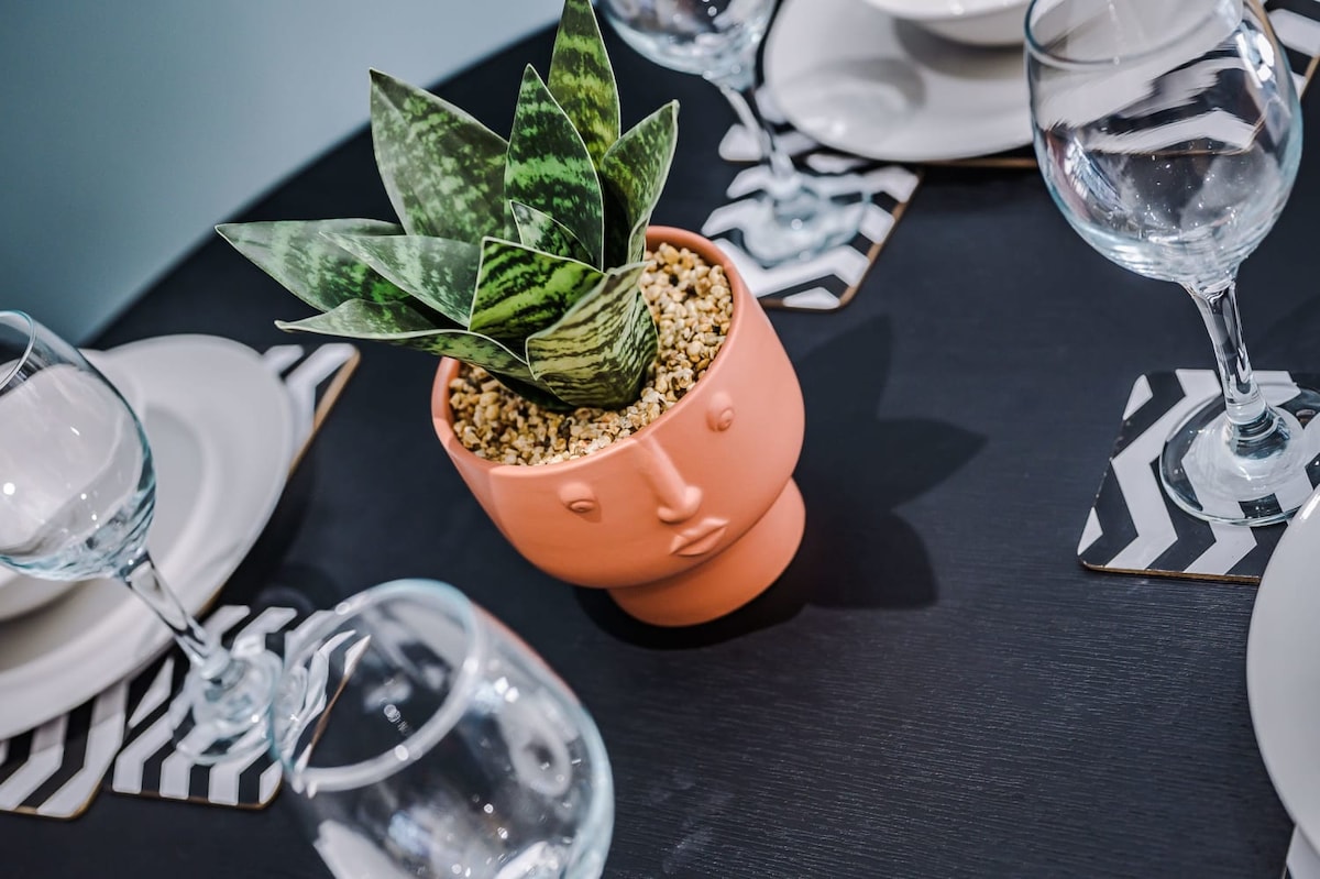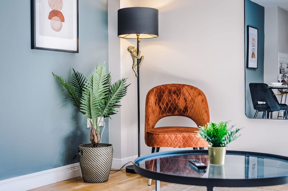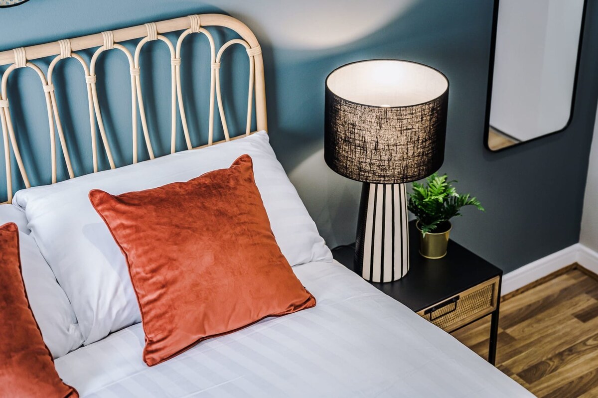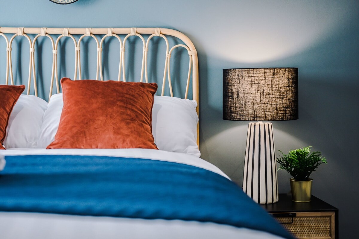 Featuring rattan furniture, bold colours, and statement pieces, this apartment is a perfect juxtaposition between cosy and contemporary.