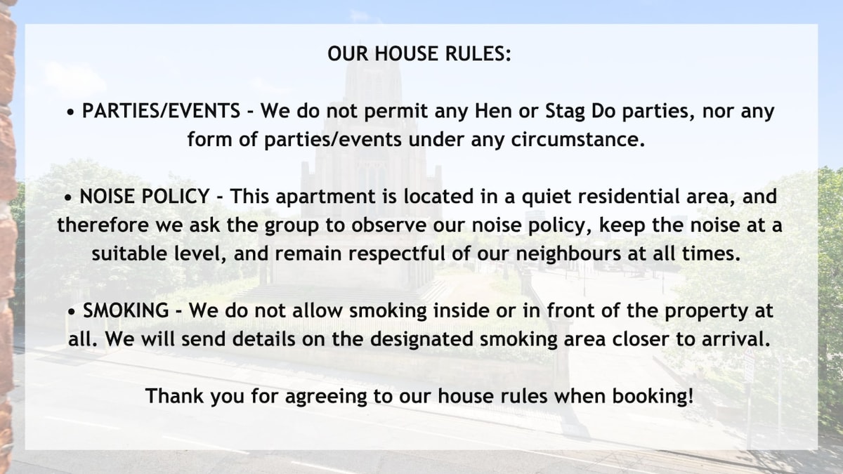 • We do not allow stag and hen nights in our property as it is in a residential building. • Any keys which are lost during the stay will be charged £50 per key. • Collecting the keys before 3 pm is strictly forbidden unless otherwise arranged and will be subject to a minimum charge of £20 per hour or part thereof, for the delays in cause to our cleaner’s schedule. This applies to dropping the keys back later than the check-out time of 10 am. • No large groups under the age of 25. • Guests will be charged £100 if there are any signs of smoking on the property. • Please make sure to return the parking permit to the flat upon check-out. Missing of parking permit can result in a deposit charge of £100.