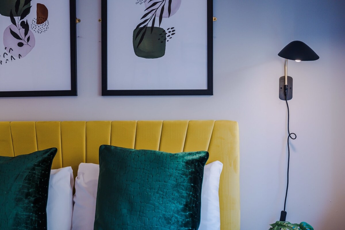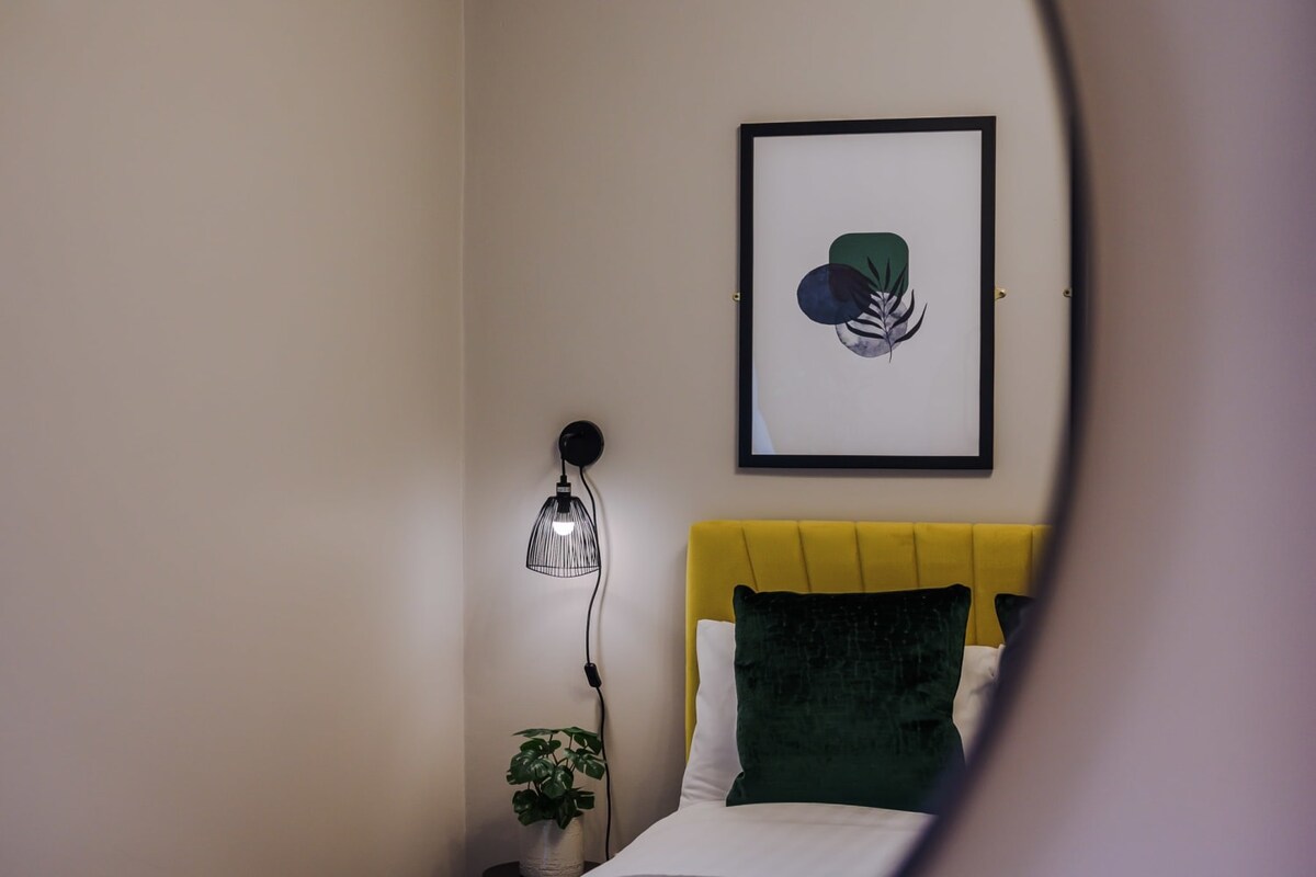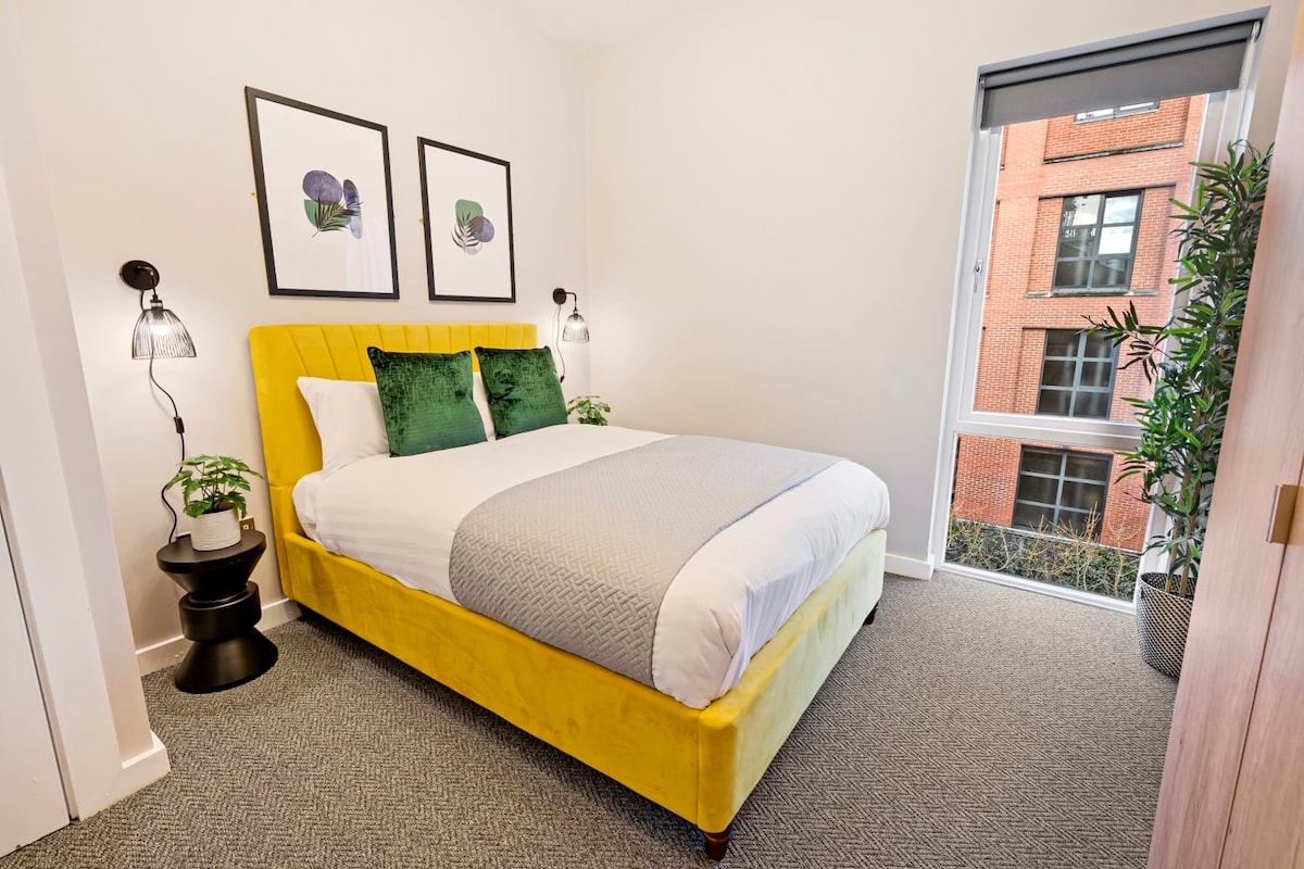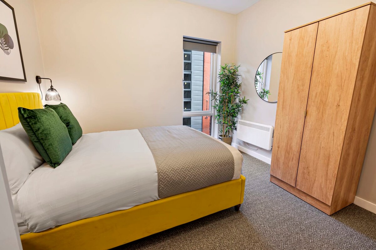 Ropewalks Quarters V boasts two double bedrooms. Each bedroom is furnished with a beautiful combination of vibrant colours from the yellow divan base and green cushions which are then complemented by elegant bedside lamps. The master bedroom is an ensuite with private access to a WC and shower.