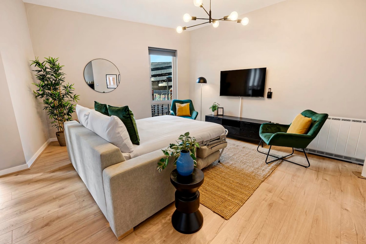 Ropewalks Quarters V has a stunning open plan living, kitchen and dining area which is perfect for socialising. As you enter the room, you will be welcomed into the lounge. Accentuated with a comfortable sofa that can be converted to a double bed, a large Smart TV and two beautiful statement chairs, the space is beautifully styled.Towards the rear of the space is the kitchen and dining area. Fully equipped with all you need for a homely stay, you’ll have use of a microwave, kettle, oven, hob, fridge/freezer and a Nespresso coffee machine! You are also free to use the washer/dryer for your laundry during your stay.