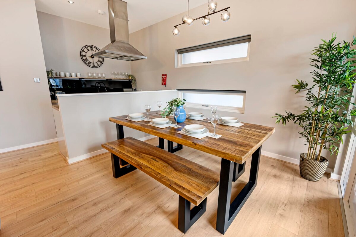 Modern and stylish, the dining area includes a wooden dining table and two matching benches which can sit up to 6 guests.