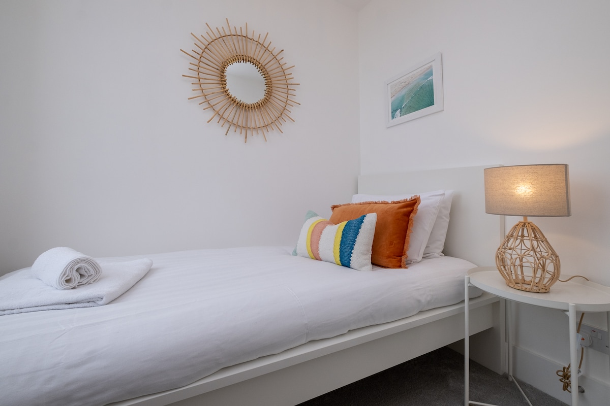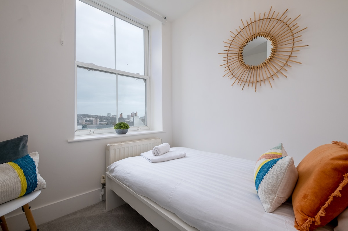 The second bedroom includes a single bed, storage space, and lovely views over the city. Fresh bed linens, towels, toiletries, a hairdryer, iron, and ironing board are all provided for your convenience.