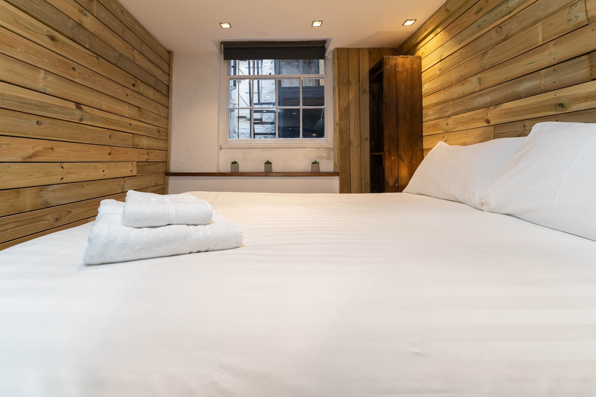 This unique rustic apartment, a five-minute stroll from the beach, offers a cozy, characterful stay for up to four guests. Styled with natural wood accents throughout, the two-bedroom space exudes a warm, rustic charm. Situated in the historic Kemptown area, the apartment is perfectly located for both beach days and city exploration, with independent shops, cafes, and vibrant spots nearby and just a 20-minute walk to the center of Brighton.Upon descending the stairs to the apartment, guests are welcomed by its inviting ambiance and distinctive aesthetics, highlighted by exposed wood finishes that run throughout. The open-plan kitchen, dining, and living area is thoughtfully arranged for relaxation and socializing. The living space is furnished with a comfortable sofa and a Smart TV, while the kitchen comes fully equipped with everything needed for meal prep, including an oven, Nespresso coffee machine, toaster, and kettle. With plenty of crockery, cookware, glassware, and cutlery, the dining table, which seats four, is an ideal spot for meals. Complimentary tea, coffee, sugar, salt, pepper, and cooking oil are provided to make your culinary experience easy and enjoyable.