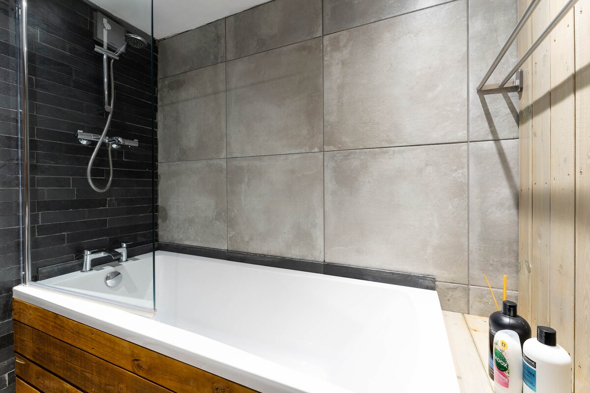 The apartment features two charming bedrooms: one with a cozy king-size bed and another with a set of unique cabin-style bunk beds. Fresh white linens, towels, and guest toiletries are thoughtfully provided. The bathroom includes a shower over the bath, complemented by stylish finishes and amenities for a comfortable stay.