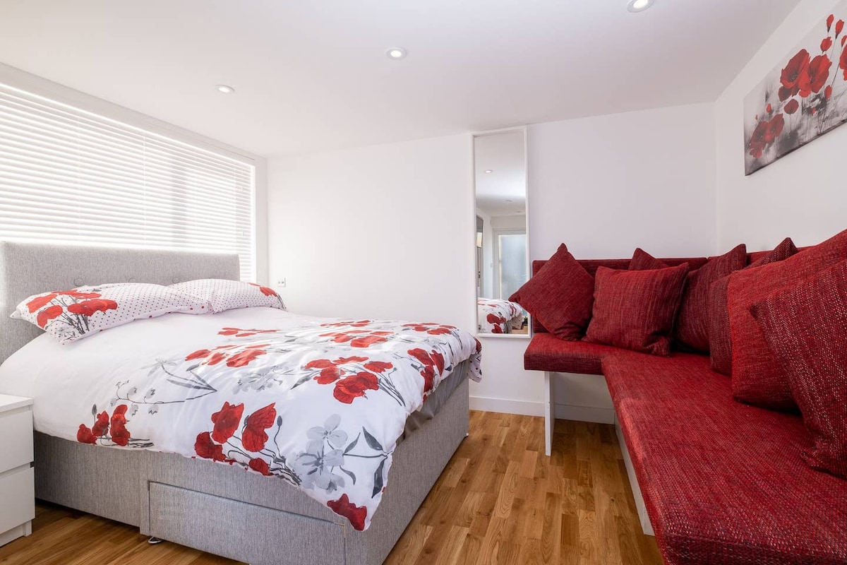 A small, modern and comfortable garage conversion that has been well thought out with some nice touches and offers great value for money. Location good, As it's a garage conversion, there is no outside space and is off a main road but noise not intrusive. Bedroom window overlooks a garden (not the studios). Cleanliness is satisfactory but needs improving. I was self isolating and was very comfortable with just enough amenities but more suited to short breaks where it is merely used as a base. I would recommend this studio. 3rd party agency, Airhost for you are very efficient in their communication but delivery is too clinical/generic and lacks the personal touch that caused a couple of errors.