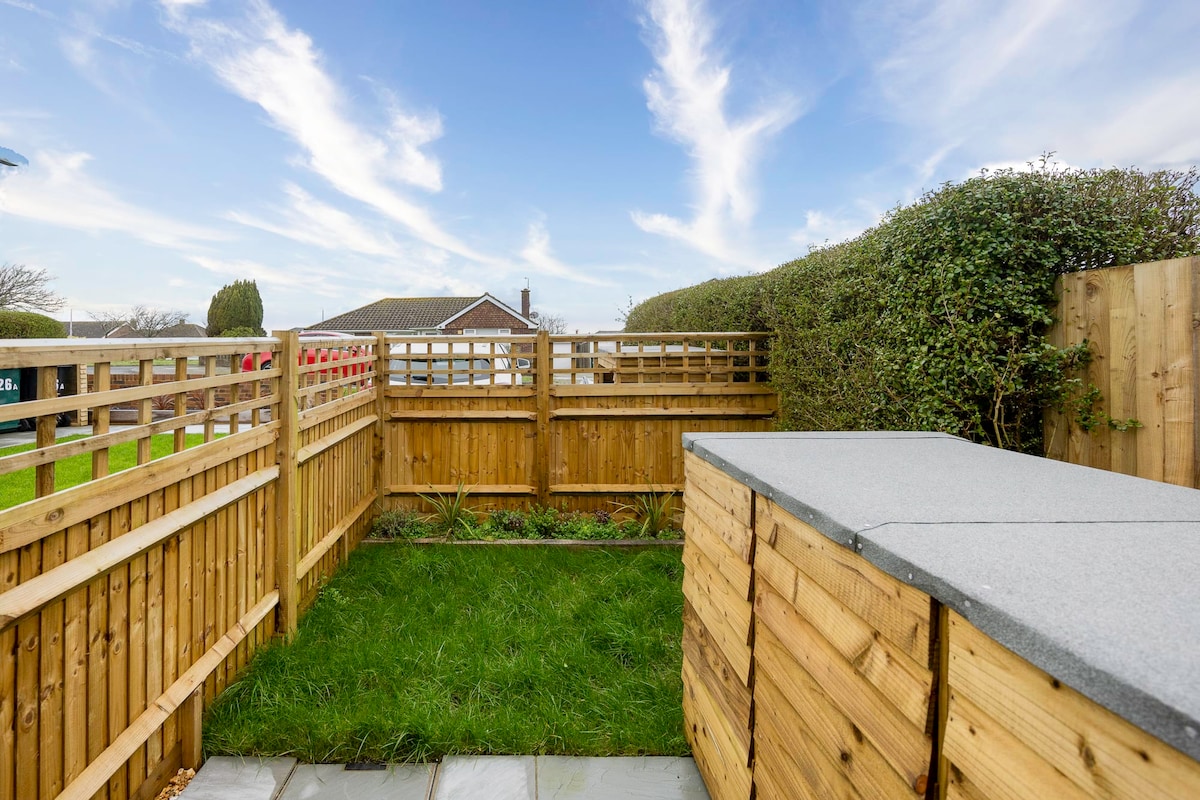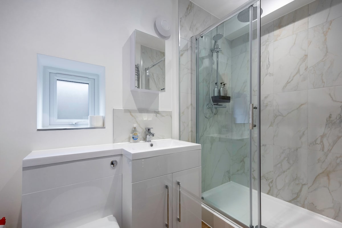 Sleeping arrangements include a plush double bed and a sofa bed, both outfitted with fresh linen and towels for every guest. A large wardrobe is available for storing personal items, and double doors open directly to the back garden, where you can enjoy the serene countryside. The bright, modern bathroom features a walk-in shower, along with guest toiletries and extra towels for added comfort.